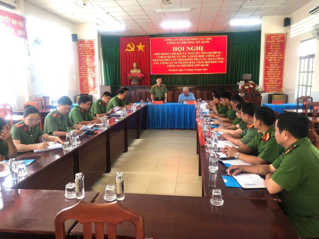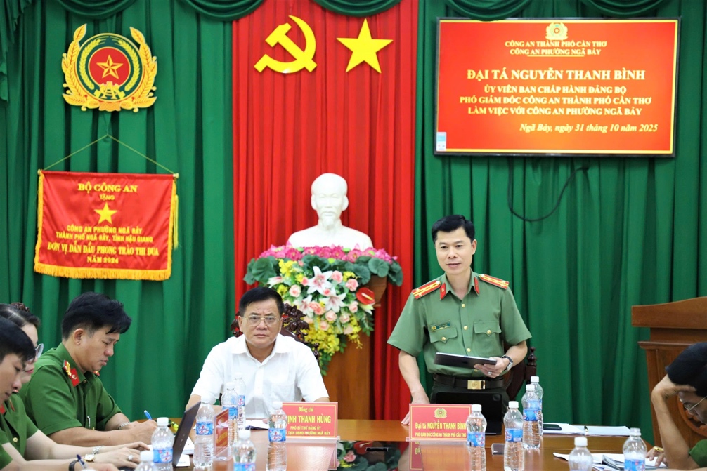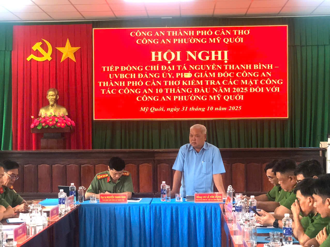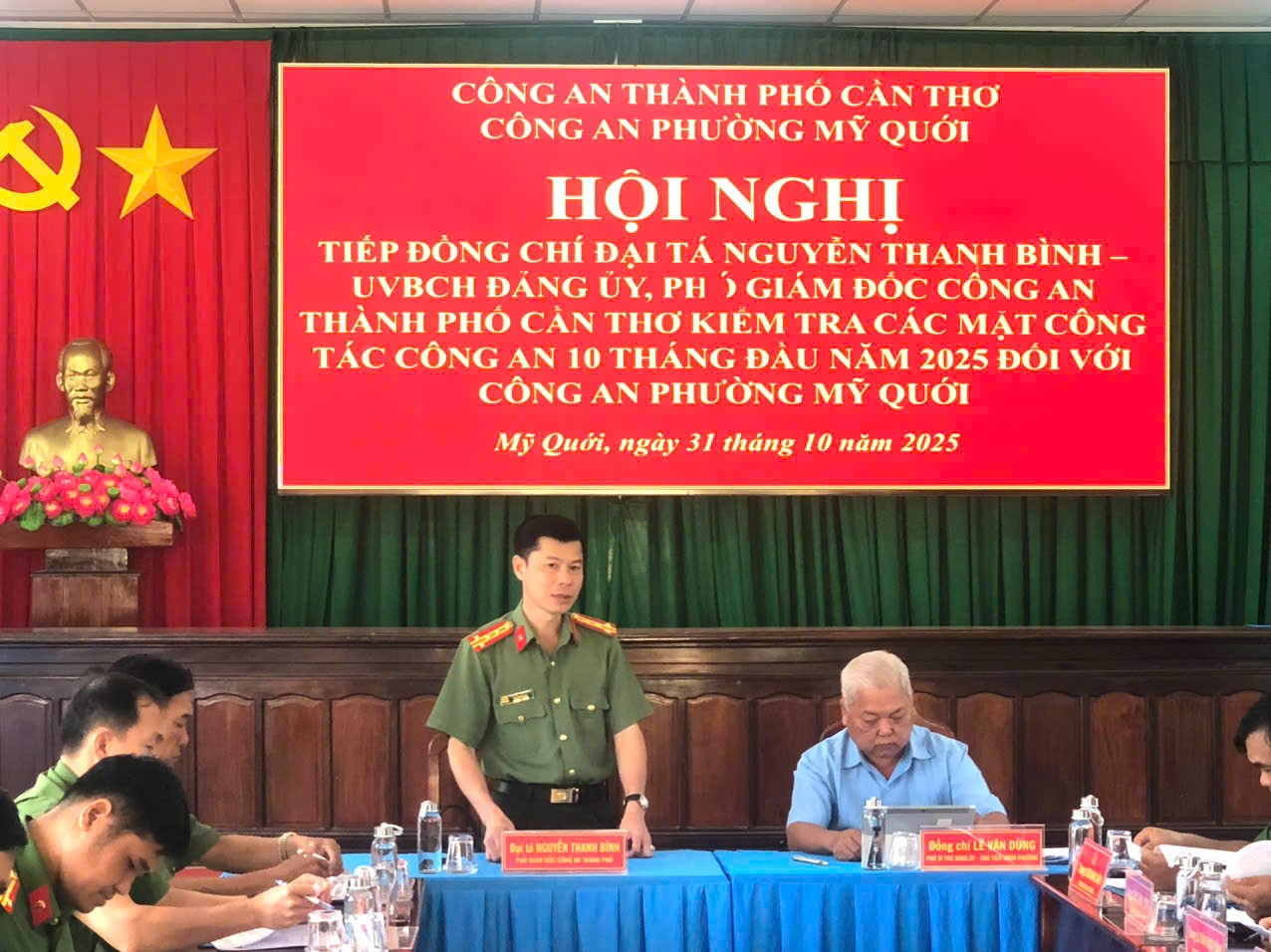 Ngày 31/10/2025, Đoàn công tác của Công an thành phố Cần Thơ do đồng chí Đại tá Nguyễn Thanh Bình, Ủy viên Ban Chấp hành Đảng bộ, Phó Giám đốc Công an thành phố làm Trưởng đoàn đã đến làm việc, kiểm tra toàn diện các mặt công tác tại Công an phường Mỹ Quới và Công an phường Ngã Bảy, cùng tham gia có lãnh đạo các phòng nghiệp vụ thuộc Công an thành phố, đại diện chính quyền địa phương, Ban Chỉ huy và Tổ trưởng các Tổ nghiệp vụ Công an 02 phường.