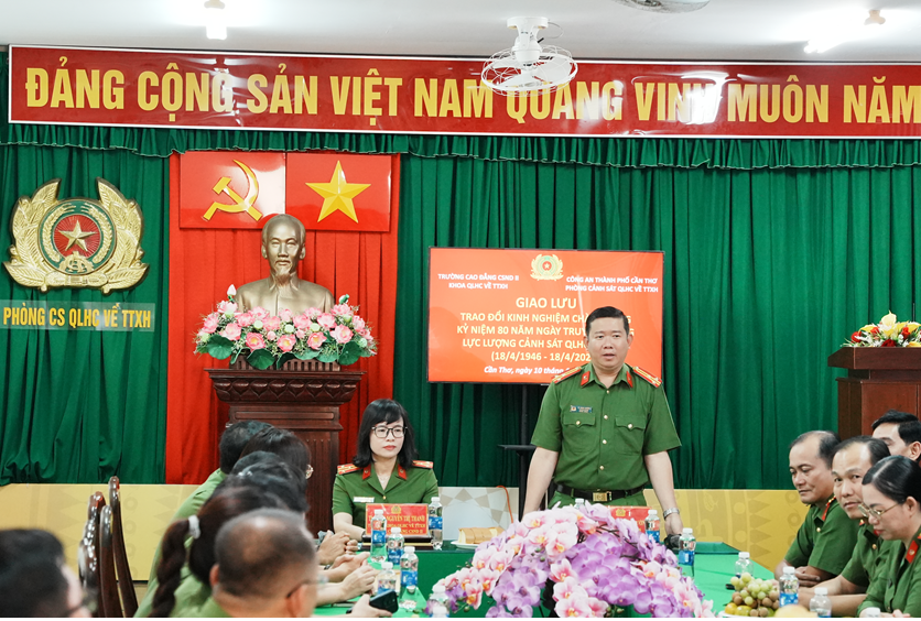 Ngày 10/4/2026, tại Công an thành phố Cần Thơ, Phòng Cảnh sát Quản lý hành chính về trật tự xã hội (QLHC về TTXH) phối hợp với Khoa QLHC về TTXH, Trường Cao đẳng Cảnh sát nhân dân II tổ chức buổi giao lưu, trao đổi kinh nghiệm nghiệp vụ. Đây là hoạt động thiết thực trong chuỗi sự kiện chào mừng kỷ niệm 80 năm Ngày truyền thống lực lượng Cảnh sát QLHC về TTXH (18/4/1946 - 18/4/2026).