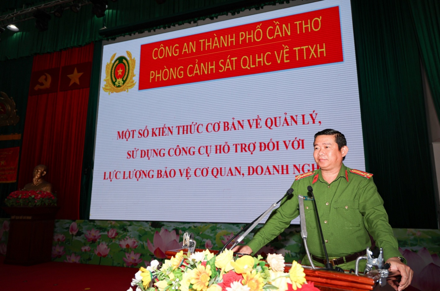 Thượng tá Lê Hùng Cường, Trưởng Phòng Cảnh sát Quản lý hành chính về trật tự xã hội triển khai nội dung cơ bản về quản lý, sử dụng công cụ hỗ trợ. Ảnh: Công an thành phố.