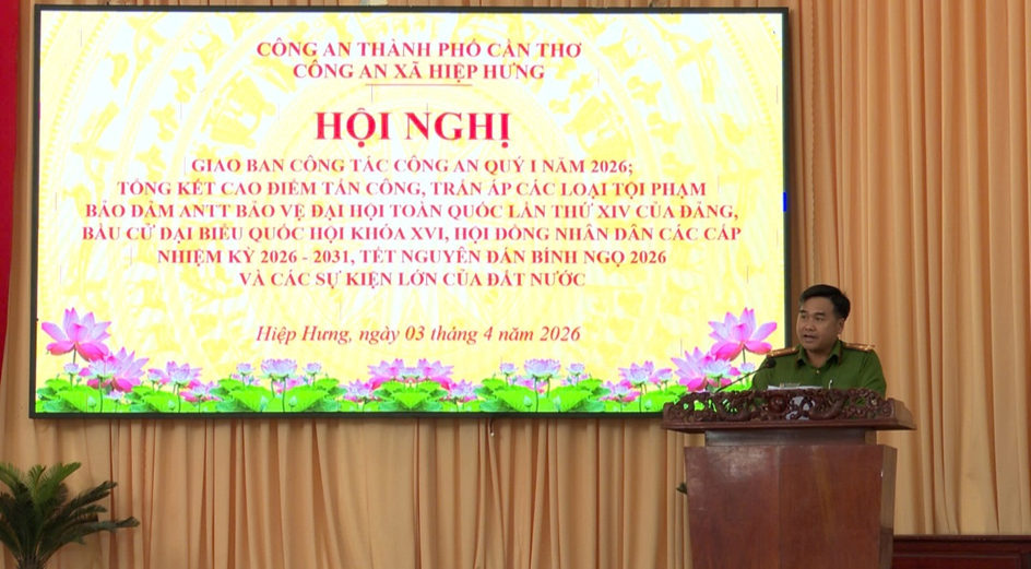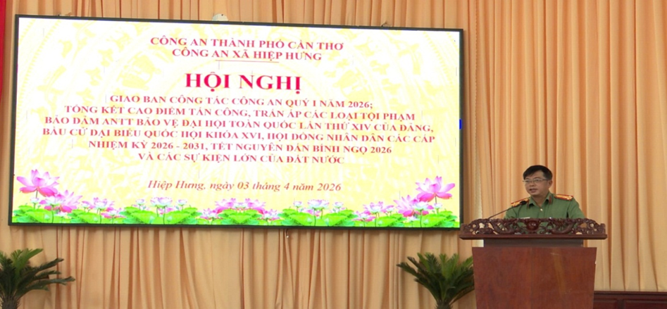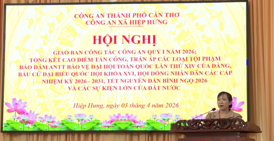 Chiều ngày 03/4/2026, Công an xã Hiệp Hưng tổ chức Hội nghị giao ban công tác Công an Quý I năm 2026; tổng kết cao điểm tấn công, trấn áp các loại tội phạm bảo đảm an ninh, trật tự phục vụ Đại hội Đảng toàn quốc lần thứ XIV của Đảng, bầu cử đại biểu Quốc hội khóa XVI, đại biểu Hội đồng nhân dân các cấp nhiệm kỳ 2026 - 2031, Tết Nguyên đán Bính Ngọ năm 2026 và các sự kiện lớn của đất nước. Tham dự Hội nghị có đồng chí Thượng tá Nguyễn Thanh Hải, Phó trưởng Phòng An ninh kinh tế, phụ trách theo dõi, chỉ đạo địa bàn và đồng chí Trương Thúy Kiều, Phó Chủ tịch Thường trực Ủy ban nhân dân xã Hiệp Hưng; cùng đại diện lãnh đạo các Phòng, ban, ngành, đoàn thể xã, Chỉ huy, cán bộ, chiến sĩ Công an xã, Trưởng các ấp và lực lượng an ninh, trật tự ở cơ sở trên địa bàn.