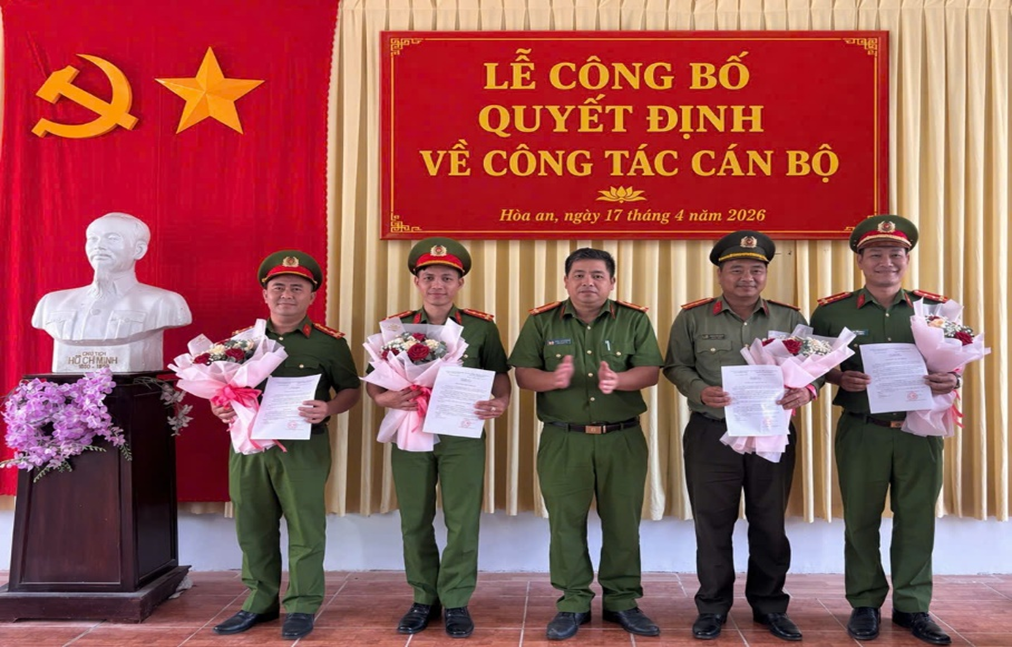Tham dự buổi lễ có đồng chí Trung tá Nguyễn Bá Phương, Trưởng Công an xã Hòa An, cùng toàn thể cán bộ, chiến sĩ trong đơn vị. Tại buổi lễ, đại diện lãnh đạo Công an xã đã công bố các quyết định về công tác cán bộ đối với các đồng chí được điều động, bổ nhiệm, phân công nhiệm vụ mới. Đây là sự ghi nhận của lãnh đạo các cấp đối với quá trình rèn luyện, cống hiến của từng cán bộ, đồng thời thể hiện sự tin tưởng, kỳ vọng vào năng lực, bản lĩnh và tinh thần trách nhiệm của các đồng chí trong thời gian tới.