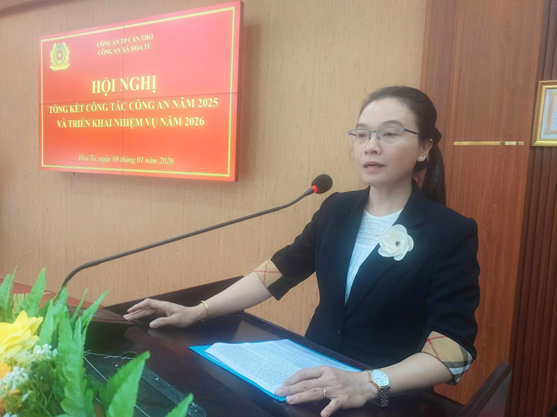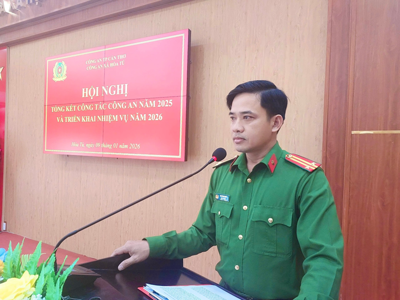 Phát biểu chỉ đạo hội nghị, đồng chí Quách Ngọc Hiểu, Chủ tịch UBND xã nhấn mạnh: năm 2026 là năm diễn ra nhiều sự kiện chính trị quan trọng, đặc biệt Đại hội đại biểu toàn quốc lần thứ XIV của Đảng; bầu cử đại biểu Quốc hội khóa XVI, Hội đồng nhân dân các cấp nhiệm kỳ 2026 – 2031. Do đó, đề nghị lực lượng Công an xã cần làm tốt tác tham mưu cho lãnh đạo Công an thành phố, Đảng ủy, UBND xã làm tốt công tác nắm tình hình, quản lý chặt địa bàn, đối tượng, kịp thời xử lý các vụ việc ngay từ cơ sở. Chủ động phối hợp với các ban ngành, đoàn thể, chính quyền địa phương phát huy sức mạnh tổng hợp của cả hệ thống chính trị và toàn dân phòng, chống tội phạm, kiềm chế sự gia tăng tội phạm, tạo sự chuyển biến tích cực về trật tự, an toàn xã hội, tiếp tục xây dựng địa bàn không ma túy; đổi mới công tác quản lý Nhà nước về an ninh, trật tự theo hướng tăng cường áp dụng khoa học, công nghệ hiện đại…. Bên cạnh đó, tập trung lực lượng bảo đảm an ninh trật tự, các sự kiện chính trị, văn hóa, xã hội trên địa bàn, trước mắt là bảo vệ tuyệt đối an toàn trước, trong và sau Tết Nguyên đán Bính Ngọ 2026. Với khẩu hiệu hành động của lực lượng Công an nhân dân năm 2026: “Theo lời Bác dạy - Đổi mới tư duy - Nâng cao tri thức - Chính quy hiện đại - Vì Đảng, vì dân”, Công an xã Hòa Tú kêu gọi toàn thể cán bộ, chiến sĩ nêu cao tinh thần trách nhiệm, phát huy tính tiền phong gương mẫu, ra sức thi đua, khắc phục khó khăn, vượt qua thử thách, năng động, sáng tạo, hoàn thành xuất sắc nhiệm vụ bảo vệ an ninh quốc gia, bảo đảm trật tự, an toàn xã hội, phục vụ tốt cho nhiệm vụ phát triển kinh tế, xã hội của địa phương.