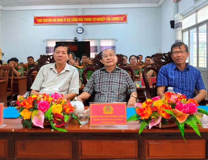 Đồng chí Huỳnh Văn Sum, nguyên Phó Bí thư thường trực Tỉnh ủy Sóc Trăng (cũ) và đồng chí Nguyễn Hoàng Lương, nguyên Chủ nhiệm Ủy ban Kiểm tra Tỉnh ủy Sóc Trăng (cũ) tặng quà Tết của Công an xã cho Ban Chỉ huy Công an xã.