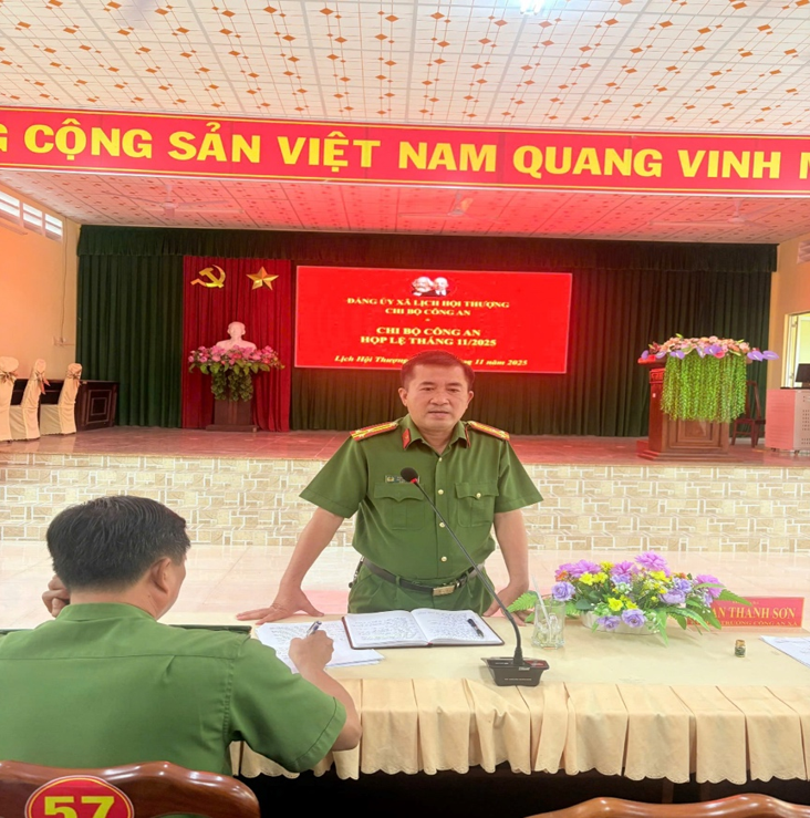 Ngày 07/11/2025, Chi bộ Công an xã Lịch Hội Thượng tổ chức sinh hoạt Chi bộ thường lệ tháng 11, đồng thời triển khai phương hướng, nhiệm vụ trọng tâm trong thời gian tới. Buổi sinh hoạt diễn ra trong không khí dân chủ, nghiêm túc, tập trung đánh giá kết quả công tác tháng 10/2025, rút kinh nghiệm thực tiễn và đề ra giải pháp nâng cao hiệu quả lãnh đạo, chỉ đạo, tổ chức thực hiện nhiệm vụ, góp phần bảo đảm an ninh chính trị, trật tự, an toàn xã hội trên địa bàn.