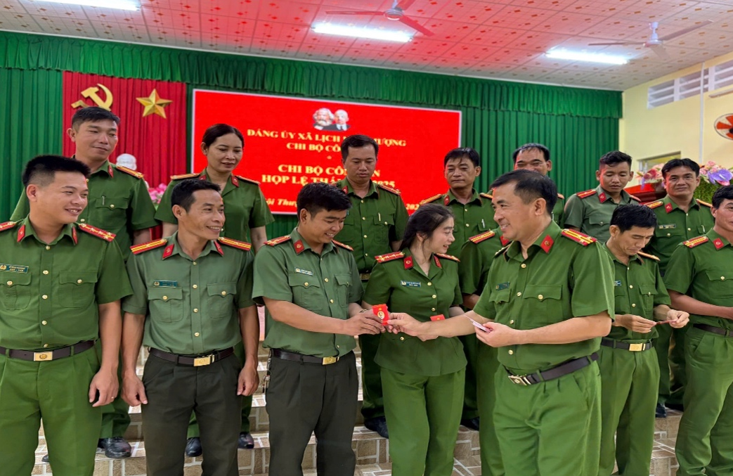 Đồng chí Thượng tá Phan Thanh Sơn, Bí thư Chi bộ, Trưởng Công an xã Lịch Hội Thượng phát thẻ Đảng viên mới cho từng đảng viên