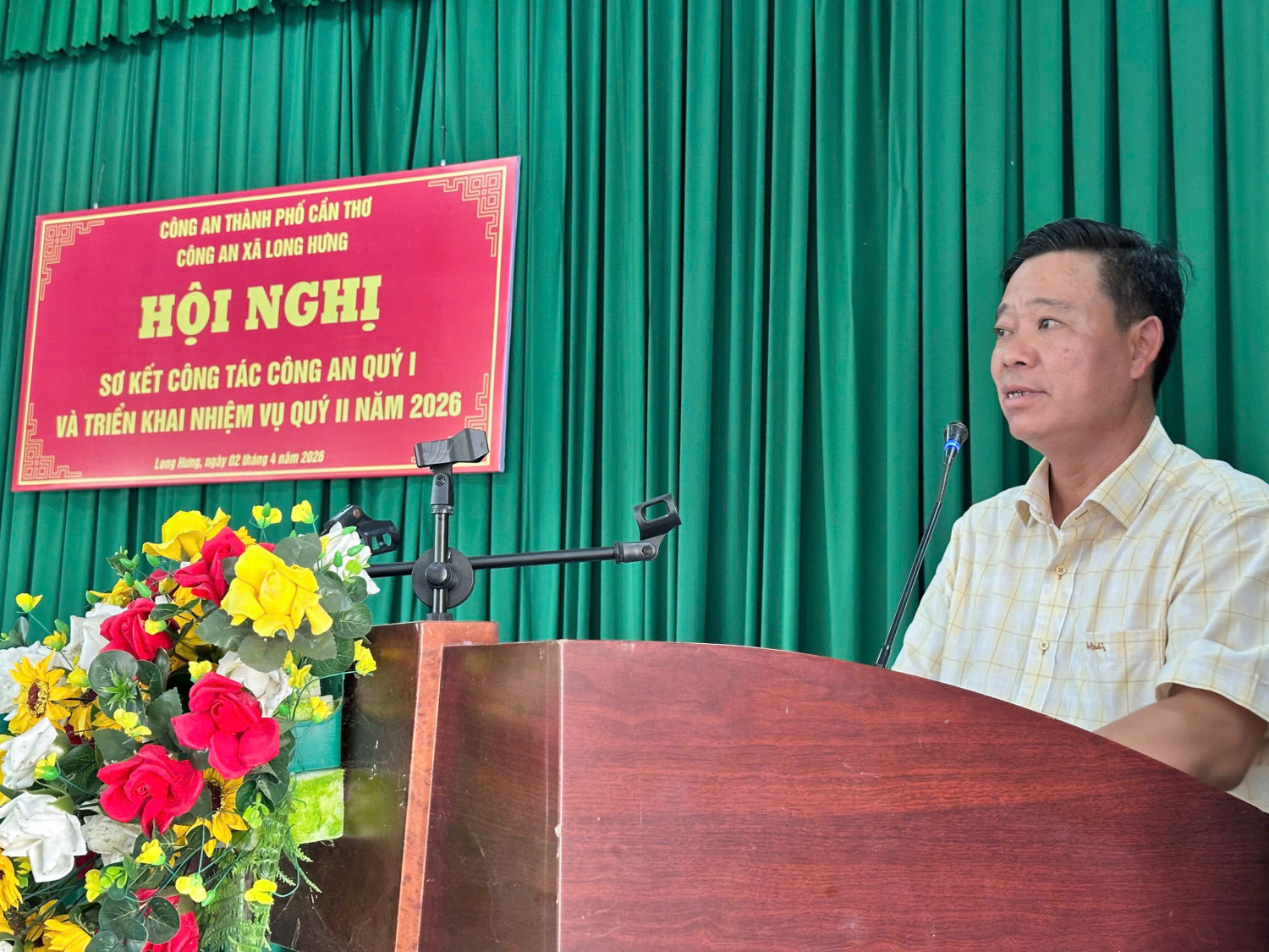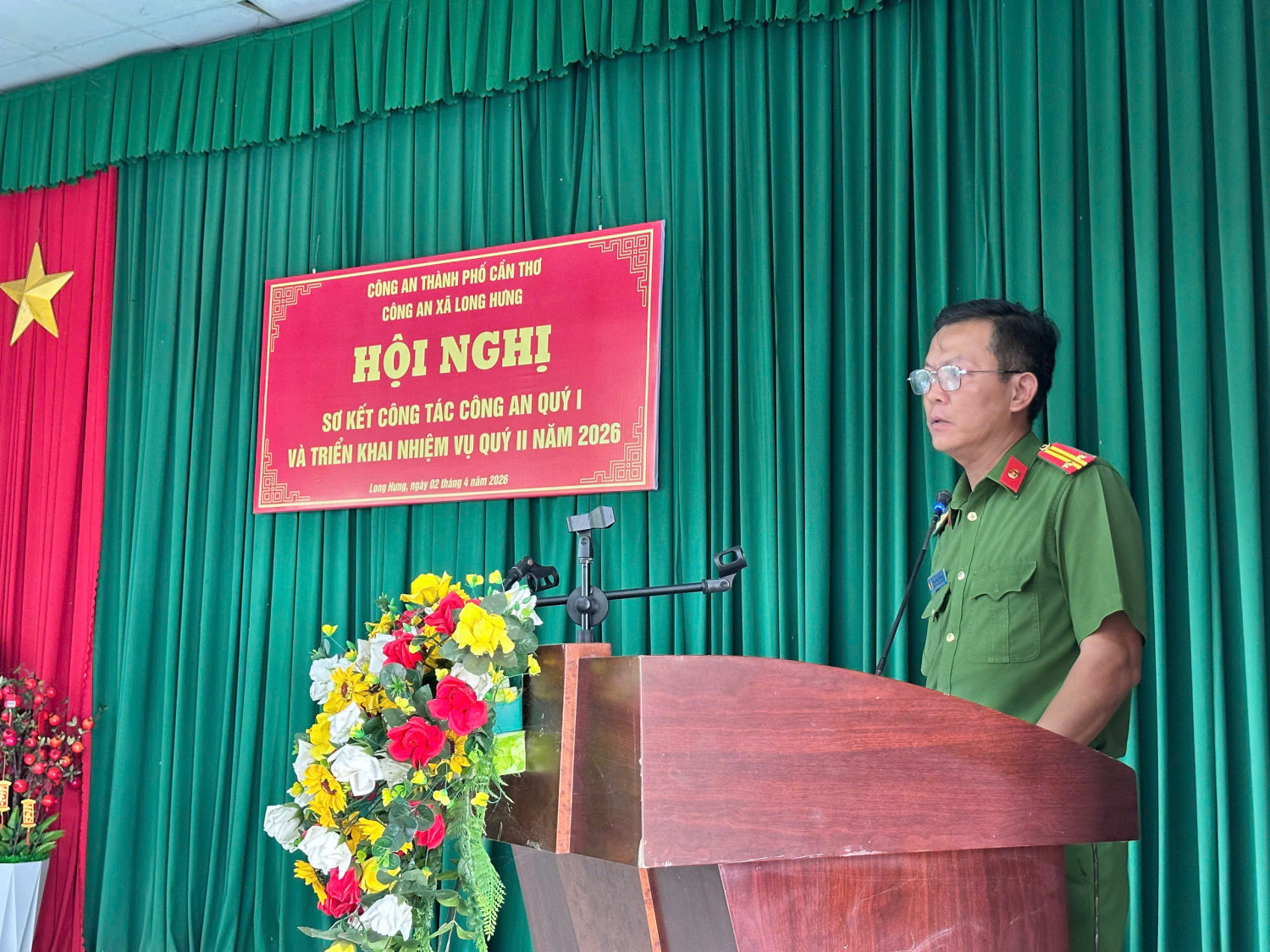 Chiều ngày 02/4/2026 Công an xã Long Hưng tổ chức Hội nghị sơ kết công tác công an quý I/2026và triển khai nhiệm vụ công tác quý II/2026; đồng thời, đánh giá kết quả thực hiện Kế hoạch số 237/KH-CATP-PV01, ngày 10/12/2025 của Giám đốc Công an thành phố Cần Thơ về việc mở cao điểm tấn công, trấn áp tội phạm, bảo đảm an ninh, trật tự bảo vệ Đại hội toàn quốc lần thứ XIV của Đảng, bầu cử đại biểu Quốc hội khóa XVI, Hội đồng nhân dân các cấp nhiệm kỳ 2026 - 2031, Tết nguyên đán Bính Ngọ 2026 và các sự kiện lớn của đất nước trên địa bàn. Tham dự Hội nghị có đồng chí Thượng tá Nguyễn Thái Hòa, Phó Trưởng phòng PC06; đồng chí Nguyễn Minh Chiến, Bí thư Đảng ủy xã; đồng chí Nguyễn Thanh Điền, Phó Bí thư Đảng ủy, Chủ tịch UBND xã; cùng đại diện các ban, ngành, đoàn thể xã; toàn thể lực lượng Công an xã và lực lượng tham gia bảo vệ an ninh, trật tự ở cơ sở trên địa bàn.
