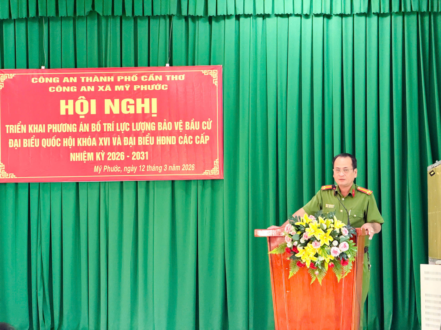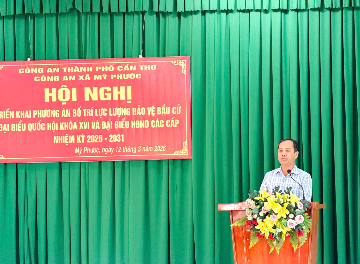 Thực hiện Phương án bảo đảm an ninh, trật tự (ANTT) bầu cử đại biểu Quốc hội khóa XVI và đại biểu Hội đồng nhân dân các cấp nhiệm kỳ 2026 - 2031 của Công an thành phố Cần Thơ, ngày 12/03/2026, Công an xã Mỹ Phước tổ chức Hội nghị triển khai Phương án đảm bảo ANTT đến toàn thể cán bộ, chiến sĩ và lực lượng bảo vệ ANTT ở cơ sở trên địa bàn.