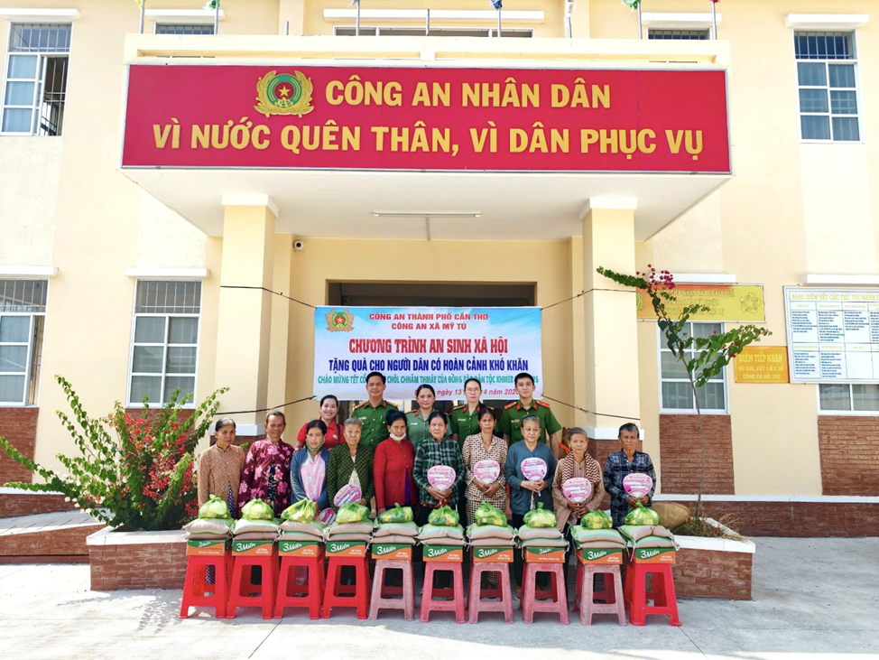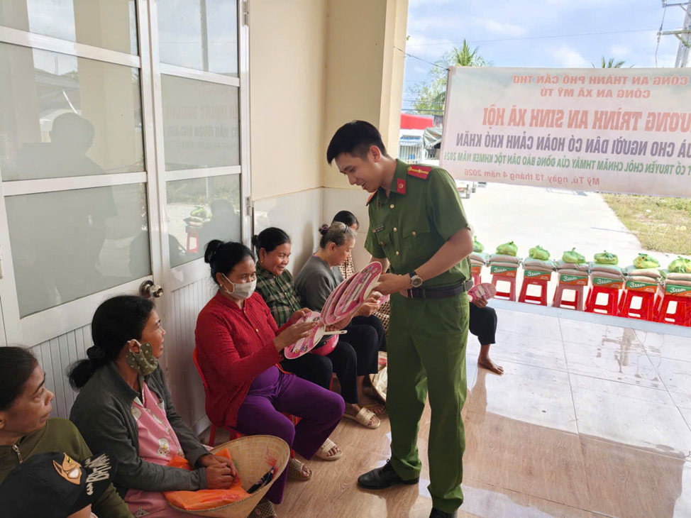 Nhân dịp Tết cổ truyền Chôl Chnăm Thmây năm 2026, đồng thời thực hiện phong trào thi đua “Ba nhất”, Công an xã Mỹ Tú đã tổ chức hoạt động trao tặng quà cho các hộ dân thuộc dân tộc Khmer có hoàn cảnh khó khăn trên địa bàn, góp phần chia sẻ, động viên bà con đón Tết vui tươi, đầm ấm. Tại buổi trao quà, có sự tham dự của đồng chí Trung tá Lư Kim Anh, Phó Trưởng Công an xã và đồng chí Đại úy Đặng Văn Đủ, Phó Trưởng Công an xã. Với tinh thần “tương thân tương ái”, lực lượng Công an xã đã trực tiếp trao 20 phần quà đến tay người dân có hoàn cảnh khó khăn, mỗi phần trị giá khoảng 300.000 đồng.