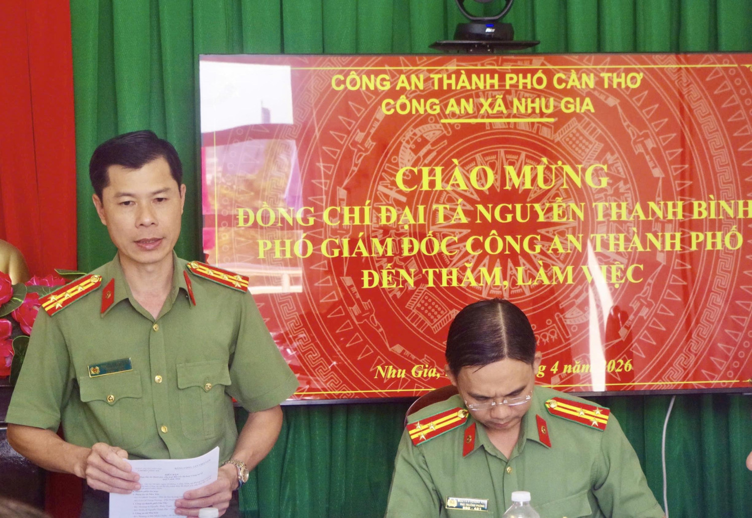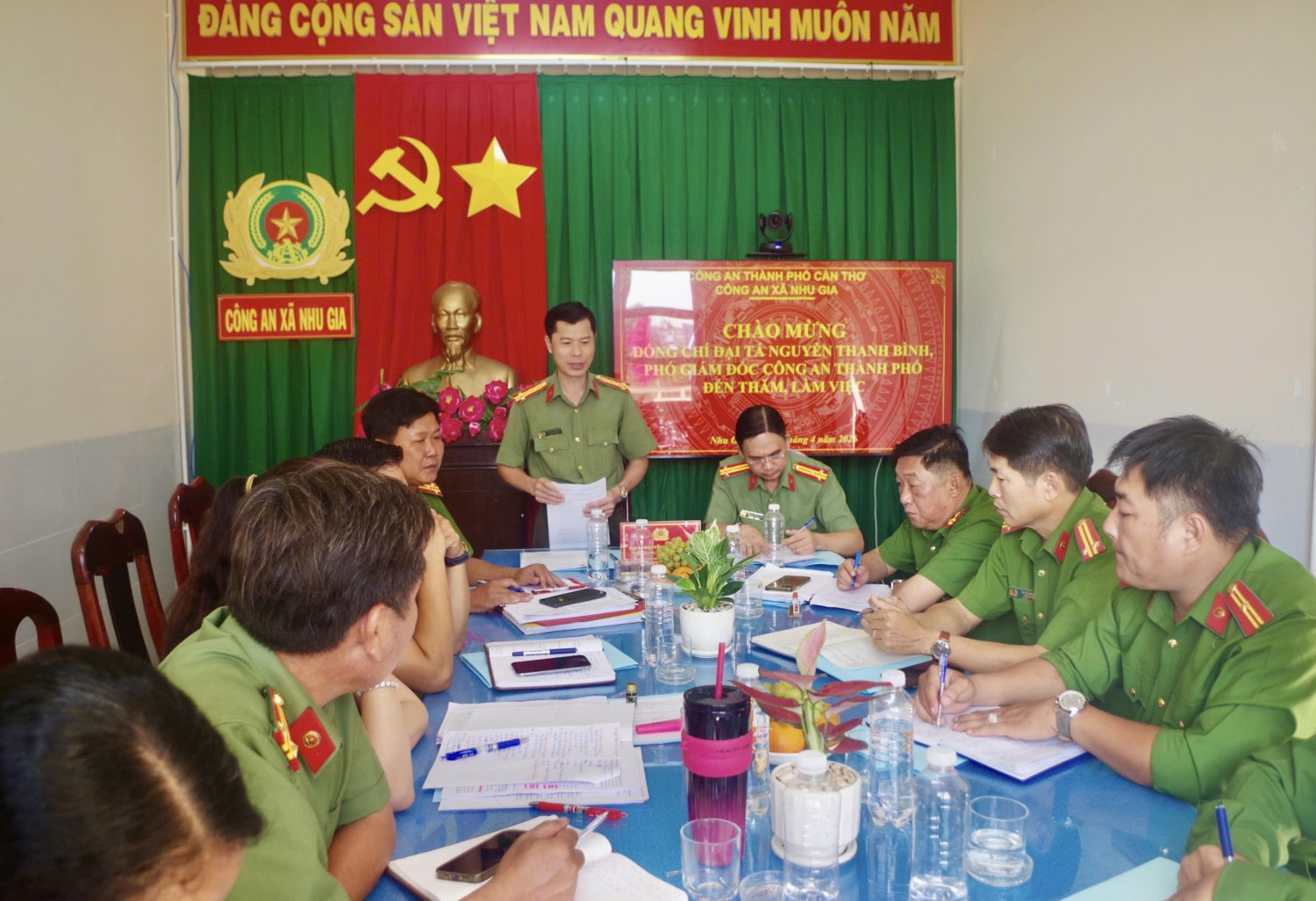Chiều ngày 09/4/2026, Đại tá Nguyễn Thanh Bình, Phó Giám đốc Công an thành phố Cần Thơ cùng đoàn công tác đã đến kiểm tra, làm việc với Công an xã Nhu Gia, nhằm đánh giá kết quả thực hiện nhiệm vụ trong quý I năm 2026 và một số nội dung then chốt trong triển khai các mặt công tác, đặc biệt là việc triển khai thực hiện xây dựng “xã không ma túy” thời gian tới.
