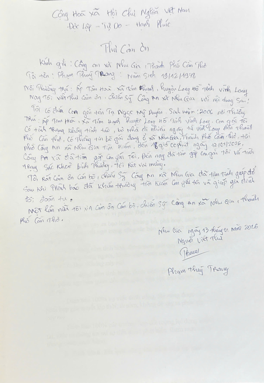 Thư cảm ơn của bà Phạm Thùy Trang gửi đến Công an xã Nhu Gia