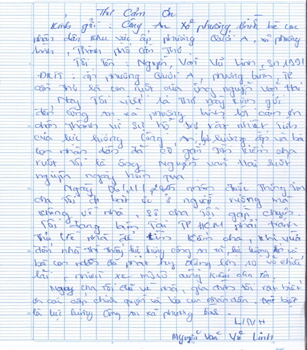 Khoảng 15 giờ, ngày 05/11/2025, ông N.V.H, trú tạiấp Phương Quới A, xã Phương Bìnhđi một mình ra khỏi nhà, thông báo với người thân là đi bắt ốc ở Kinh Đồng Gò. Ông điều khiển một võ lãi composite, nhưng đến sáng hôm sau vẫn chưa trở về. Gia đình đã tìm kiếm khắp nơi nhưng không có kết quả.Ông N.V.H và gia đình cảm ơn lực lượng Công an xã Phương Bình Đến 11 giờ cùng ngày, gia đình trình báo với Công an xã Phương Bình. Ngay sau khi tiếp nhận, Công an xã cử lực lượng xuống nhà xác minh. Qua xác minh, được biết ông Hai thường xuyên uống rượu, có tiền sử bệnh huyết áp và nhồi máu não, nên gia đình lo ngại ông gặp nguy hiểm khi đi bắt ốc. Chỉ huy Công an xã nhanh chóng huy động cán bộ, chiến sĩ và Lực lượng bảo vệ an ninh, trật tự ở cơ sở phối hợp với người dân địa phương và gia đình tìm kiếm tại dọc tuyến sông, kênh rạch trên địa bàn, các khu vực ông N.V.H thường tới. Hơn 10 chiếc võ lãi của bà con được huy động, tìm kiếm liên tục từ 11 giờ đến tối, nhưng chưa phát hiện.Thư cảm ơn của gia đình ông Nguyễn Văn Hai Đến 19 giờ tối, ngày 06/11/2025, Công an xã Phương Bình và Lực lượng bảo vệ an ninh, trật tự ở cơ sở phát hiện ông N.V.H đã về nhà an toàn và thông báo ngay cho Công an xã. Sau đó, gia đình ông N.V.H đã gửi thư cảm ơn đến bà con Nhân dân cùng lực lượng Công an xã tích cực hỗ trợ trong việc tìm kiếm người thân, bày tỏ trân trọng tinh thần trách nhiệm, tận tâm vì Nhân dân phục vụ của lực lượng Công an xã./.