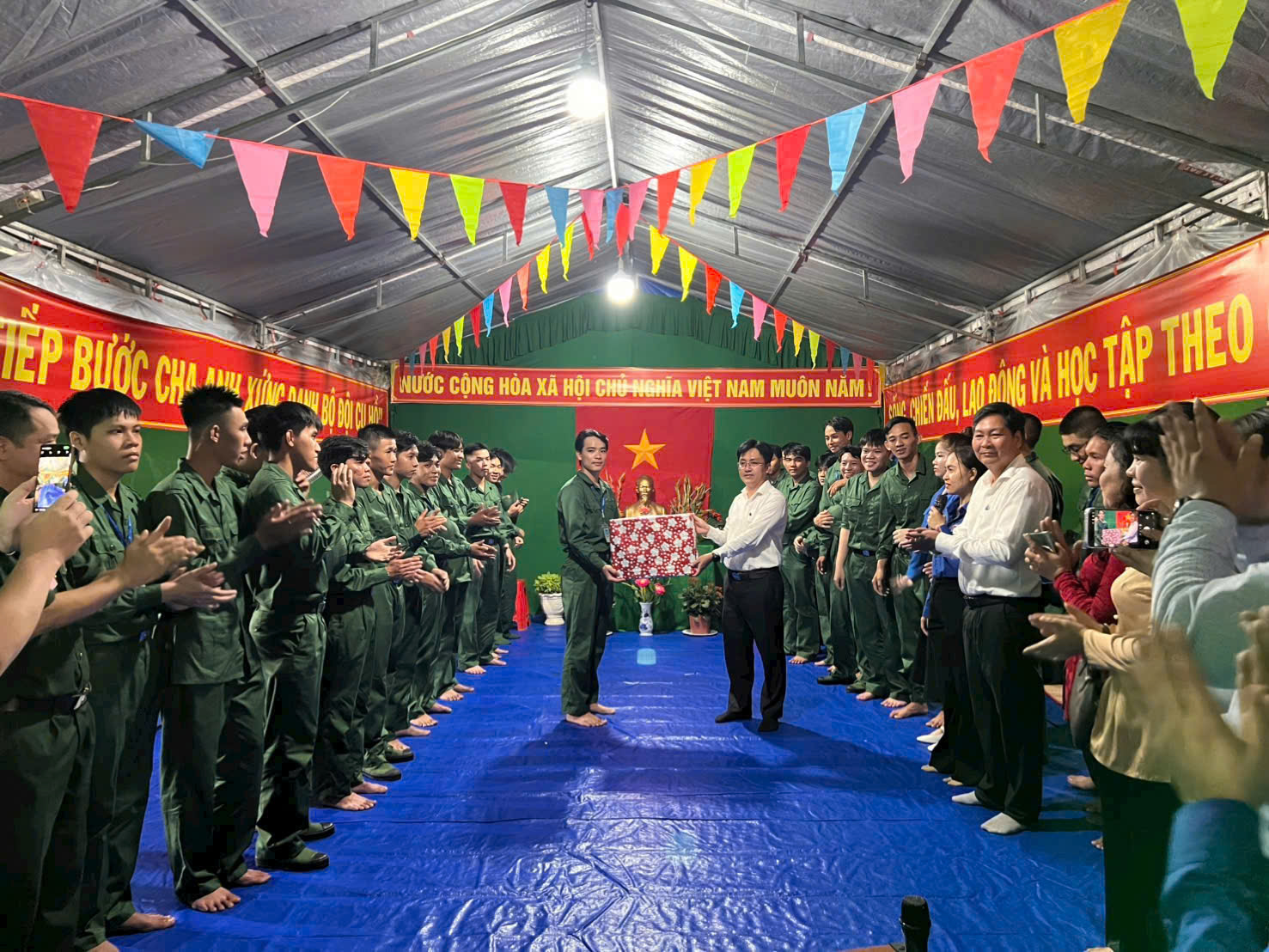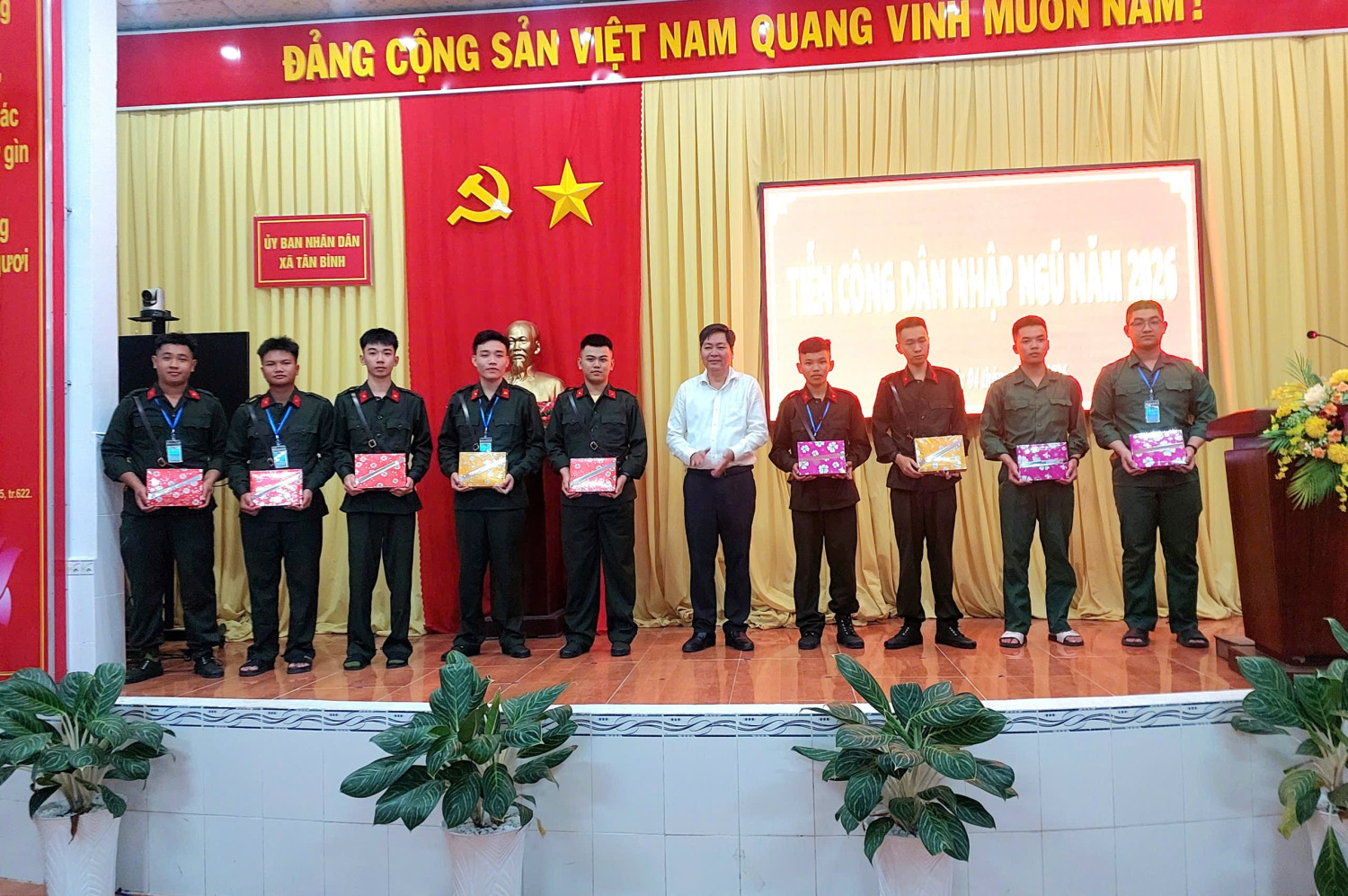 Đồng chí Nguyễn Vũ Trường, Bí thư Đảng ủy xã tặng quà cho các thanh niên tham gia nghĩa vụ năm 2026.