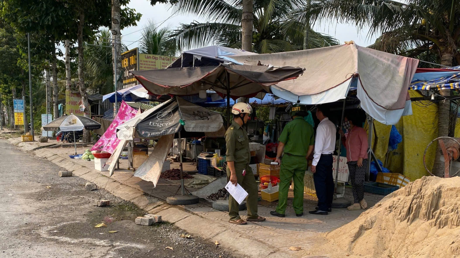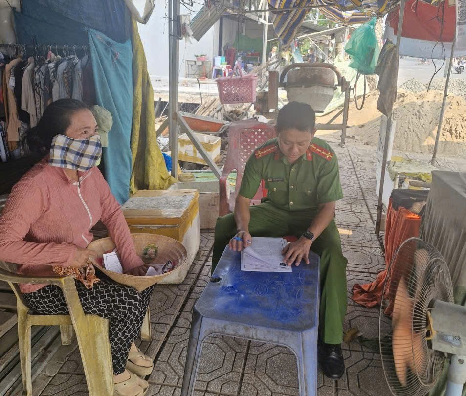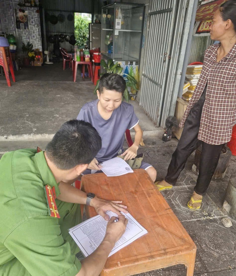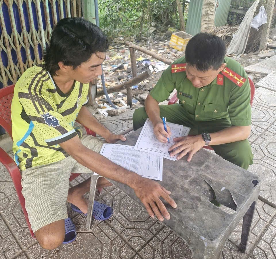 Cán bộ, chiến sĩ Công an xã Tân Hòa và cán bộ Phòng Kinh tế, Phòng Văn hóa - Xã hội xã kiểm tra, tuyên truyền, nhắc nhở và cho người dân ký cam kết không vi phạm các quy định về trật tự công cộng, trật tự đô thị, trật tự an toàn giao thông