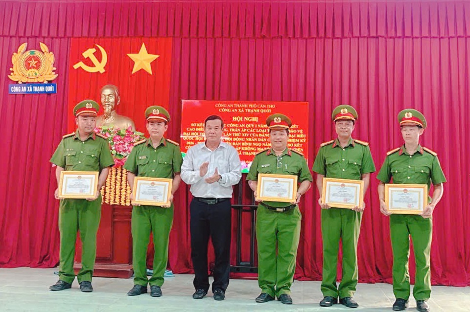 Phát biểu chỉ đạo tại hội nghi, đồng chí Cao Văn Ngoan, Phó Bí thư Đảng ủy - Chủ tịch Ủy ban nhân dân xã ghi nhận, đánh giá cao những kết quả Công an xã Thạnh Quới đã đạt được trong đợt cao điểm tấn công trấn áp tội phạm, đảm bảo ANTT trên địa bàn. Về nhiệm vụ trọng tâm trong thời gian tới, đồng chí Chủ tịch Ủy ban nhân dân xã đề nghị: Công an xã tiếp tục tham mưu cho cấp ủy, chính quyền chỉ đạo tổ chức triển khai hiệu quả các giải pháp bảo đảm ANTT trên địa bàn; chủ động nắm tình hình an ninh xã hội, an ninh nội bộ, an ninh kinh tế… giải quyết tốt các vấn đề liên quan đến ANTT, không để bị động bất ngờ, xảy ra. Phát động sâu rộng phong trào toàn dân bảo vệ an ninh Tổ quốc, tăng cường tuyên truyền, phổ biến giáo dục pháp luật, chú trọng tuyên truyền về các phương thức, thủ đoạn hoạt động mới của các loại tội phạm để nhân dân biết tự bảo vệ, phòng ngừa và tố giác tội phạm. Bên cạnh đó tham mưu, phối hợp giải quyết dứt điểm những mâu thuẩn trong nội bộ nhân dân, không xảy ra điểm nóng. Tăng cường công tác quản lý nhà nước về ANTT; tăng cường công tác quản lý vũ khí, vật liệu nổ, công cụ hỗ trợ, công tác phòng chống cháy nổ. Làm tốt công tác điều tra, xử lý tội phạm, đúng người, đúng tội, không để xảy ra oan sai, sót lọt, tội phạm; tập trung làm tốt công tác xây dựng Đảng, xây dựng lực lượng, xây dựng Công an xã Thạnh Quới thật sự trong sạch, vững mạnh, chính quy, tinh nhuệ, hiện đại, đáp ứng yêu cầu nhiệm vụ trong tình hình mới. Nhân dịp này, Chủ tịch Ủy ban nhân dân xã đã tặng giấy khen cho 01 tập thể và 10 cá nhân đã có thành tích xuất sắc.