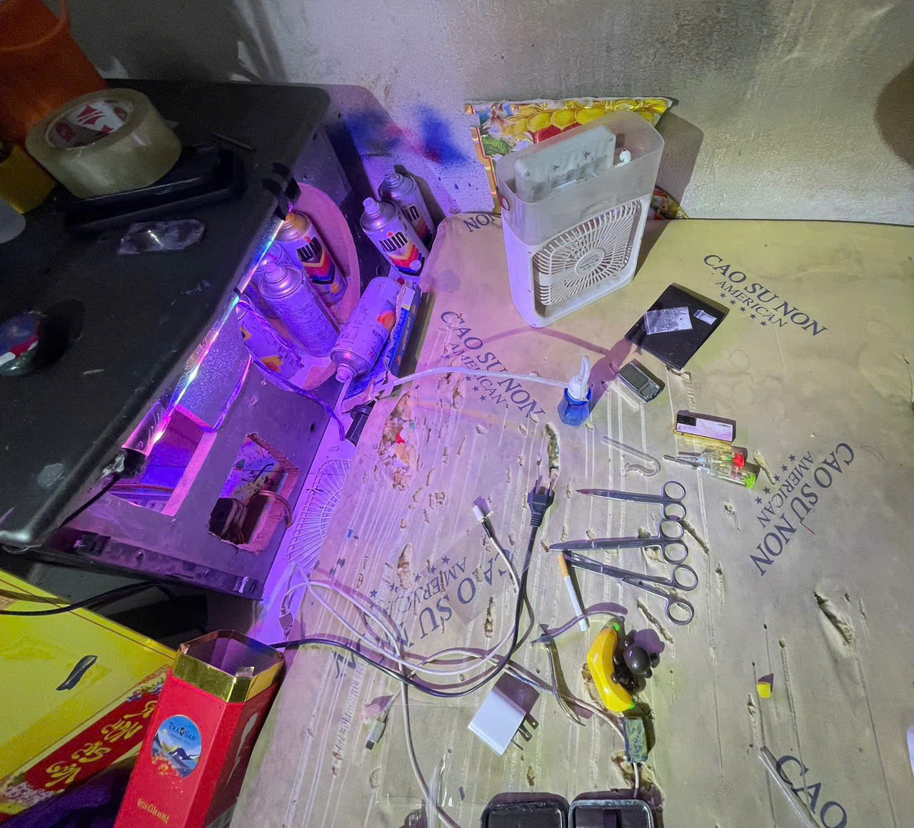 Tiến hành khám xét tại hiện trường, lực lượng Công an đã tạm giữ nhiều đoạn ống bịt nilon bên trong có chứa tinh thể màu trắng nghi là ma túy; 06 điện thoại các loại đã qua sử dụng và Tiền Việt Nam hơn 150.000.000 đồng cùng các tang vật khác có liên quan. Đồng thời, qua test nhanh, cả 02 đối tượng Lê Văn Tứ Duẩn và Lê Thị Kim Loan đều dương tính với ma túy.