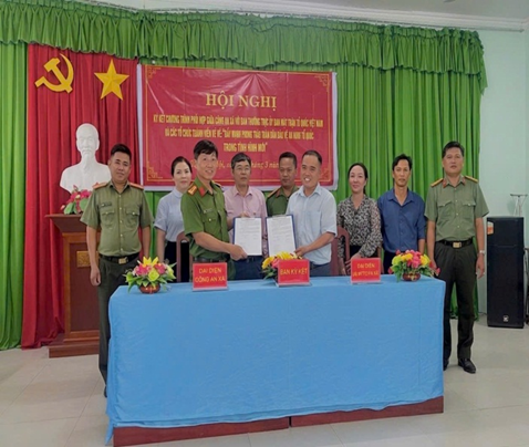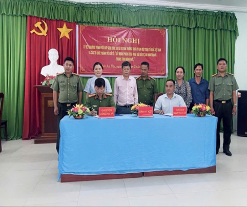 Đ/c Trung tá Lê Thanh Liêm, Trường Công an xã ký kết chương trình phối hợp cùng Đ/c Lâm Hồng Thúy Ngân, đại diện Ủy ban Mặt trận Tổ quốc Việt Nam xã Thới An Hội