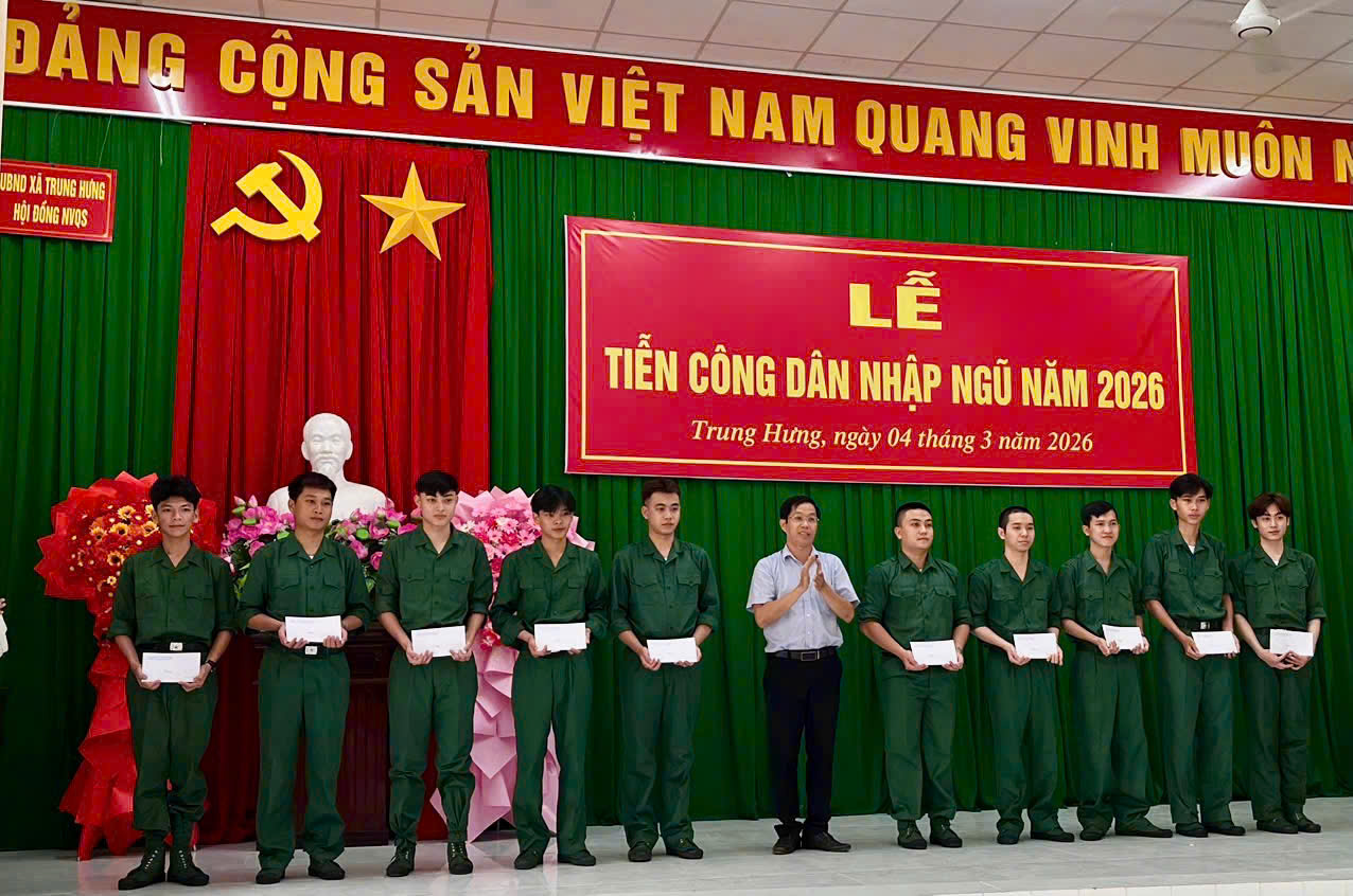Đồng chí Trần Văn Đạt, Phó Bí thư Đảng ủy, Chủ tịch Ủy ban nhân dân, Chủ tịch Hội đồng Nghĩa vụ quân sự xã Trung Hưng trao quà động viên thanh niên lên đường thực hiện nghĩa vụ quân sự tại Lễ tiễn công dân nhập ngũ năm 2026.