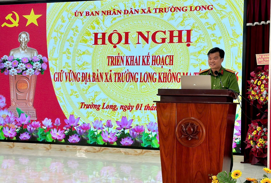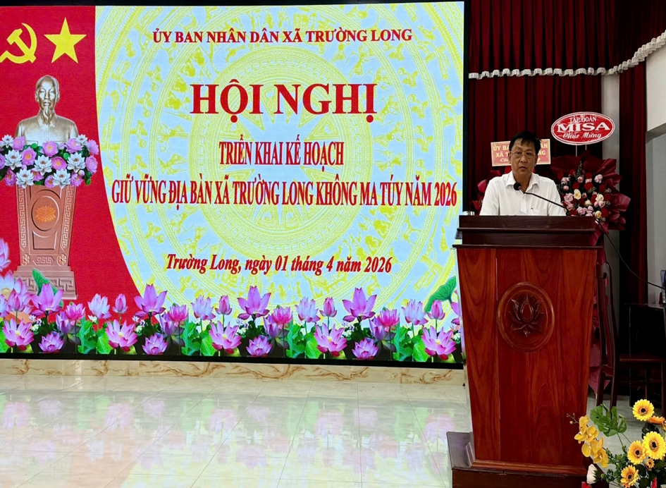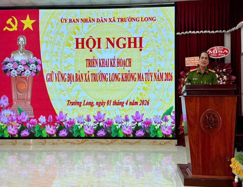 Vừa qua, Công an xã Trường Long đã long trọng tổ chức Hội nghị triển khai kế hoạch giữ vững địa bàn xã Trường Long không ma túy năm 2026. Đây được xác định là nhiệm vụ chính trị trọng tâm, hàng đầu trong năm 2026 và những năm tiếp theo. Tham dự Hội nghị có đồng chí Thượng tá Nguyễn Hoàng Lâm, Phó Trưởng Phòng An ninh nội địa; đồng chí Thượng tá Bùi Thanh Liếp, Phó Trưởng Phòng Cảnh sát điều tra tội phạm về ma túy; đồng chí Thái Mỹ Nhung, Phó Chánh án Tòa án nhân dân Khu vực 3, thành phố Cần Thơ; đồng chí Đặng Hải Âu, Bí thư Đảng ủy, Chủ tịch Hội đồng nhân dân xã; đồng chí Nguyễn Văn Thắng, Phó Bí thư Đảng ủy, Chủ tịch Ủy ban nhân dân xã; đồng chí Đỗ Ngọc Quới, Ủy viên Ban Thường vụ Đảng ủy, Chủ tịch Ủy ban Mặt trận Tổ quốc Việt Nam xã. Cùng tham dự còn có Ban Chỉ huy và toàn thể cán bộ, chiến sĩ Công an xã; đại diện lãnh đạo các ban, ngành, đoàn thể; Bí thư chi bộ kiêm Trưởng các ấp và lực lượng tham gia bảo vệ an ninh, trật tự ở cơ sở.