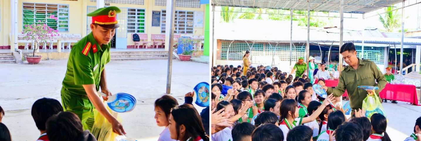 Lực lượng Công an xã phát quạt tuyên truyền cho học sinh tại điểm trường