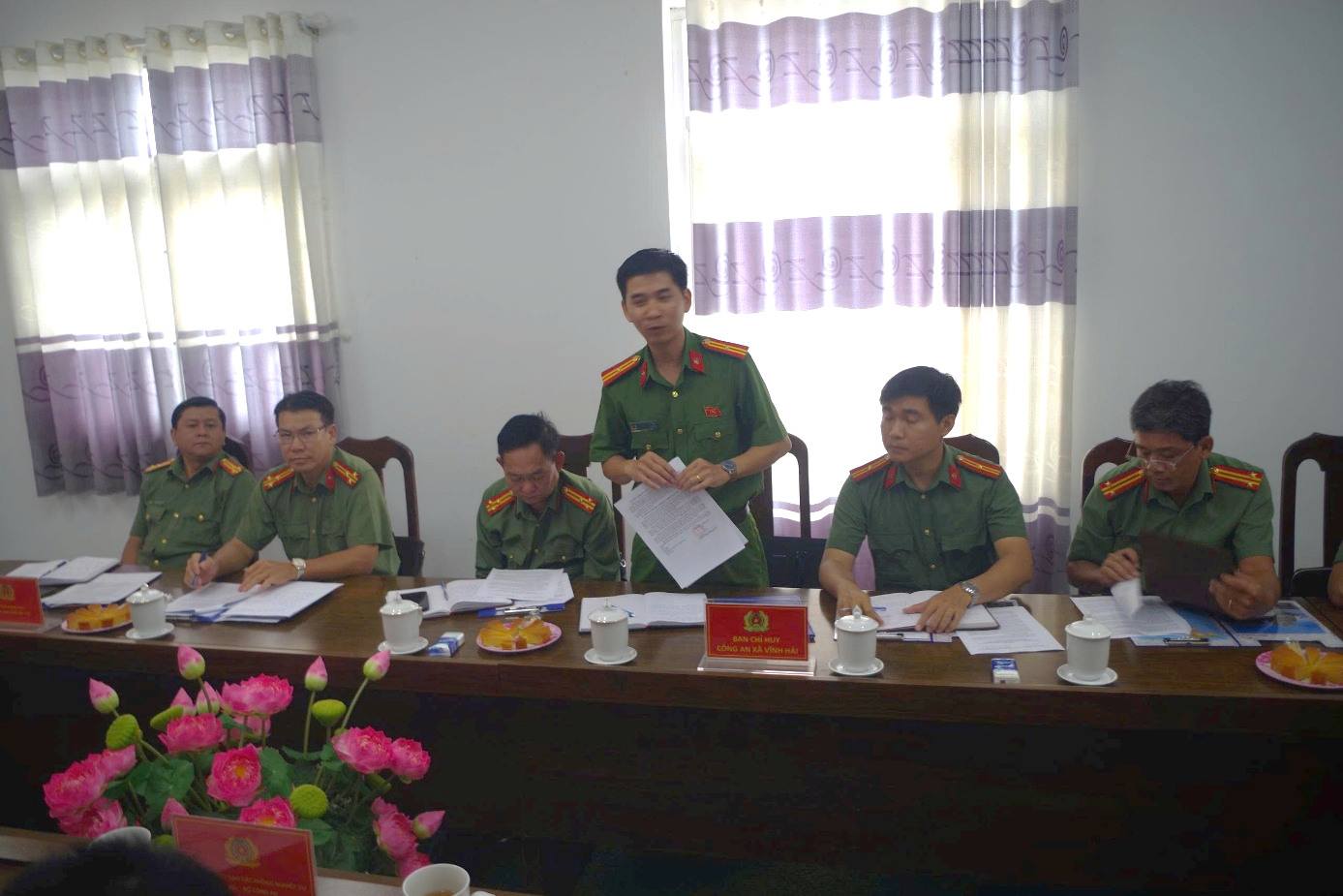 Căn cứ kế hoạch của Bộ Công an về hướng dẫn, kiểm tra việc thực hiện nhiệm vụ an ninh đối ngoại tại công an cấp xã, Đoàn công tác số 4 đã đến làm việc trực tiếp với Công an xã Vĩnh Hải nhằm nắm bắt kết quả thực hiện nhiệm vụ an ninh đối ngoại của đơn vị trong thời gian qua, nhất là sau khi triển khai mô hình Công an 03 cấp. Tại buổi làm việc, sau khi nghe đồng chí Thiếu tá Đặng Hoàng Phúc, Trưởng Công an xã Vĩnh Hải báo cáo kết quả thực hiện các mặt công tác trên lĩnh vực an ninh đối ngoại, các thành viên Đoàn công tác đã khảo sát tình hình cơ sở vật chất, trang thiết bị, trực tiếp kiểm tra hồ sơ, tài liệu và trao đổi, làm rõ thêm một số nội dung có liên quan.
