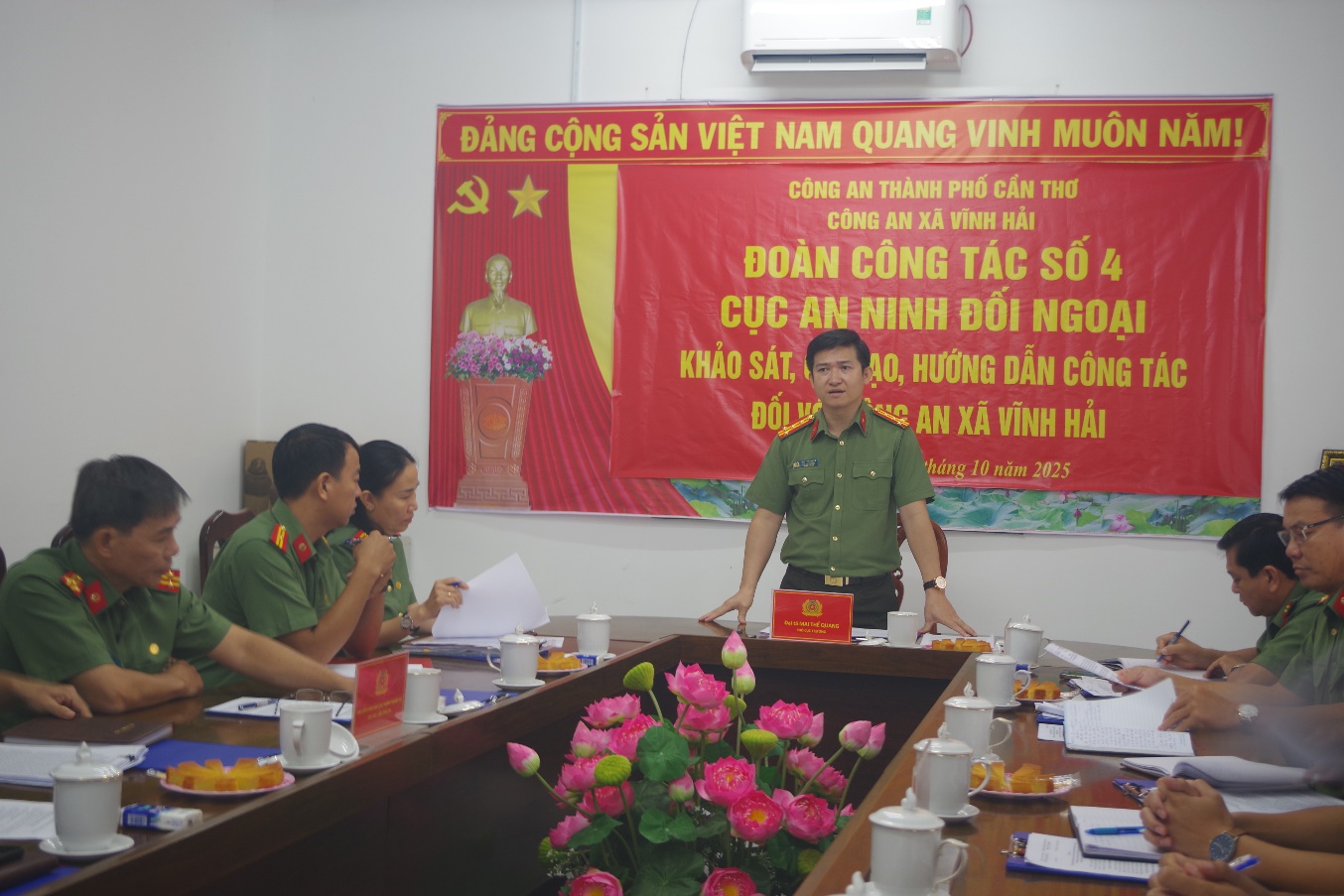 Ngày 28/10/2025, Đoàn công tác số 4 của Cục An ninh đối ngoại, Bộ Công an do đồng chí Đại tá Mai Thế Quang, Phó Cục trưởng làm Trưởng đoàn đã đến làm việc với Công an xã Vĩnh Hải, thành phố Cần Thơ. Cùng dự buổi làm việc có lãnh đạo Phòng An ninh đối ngoại.