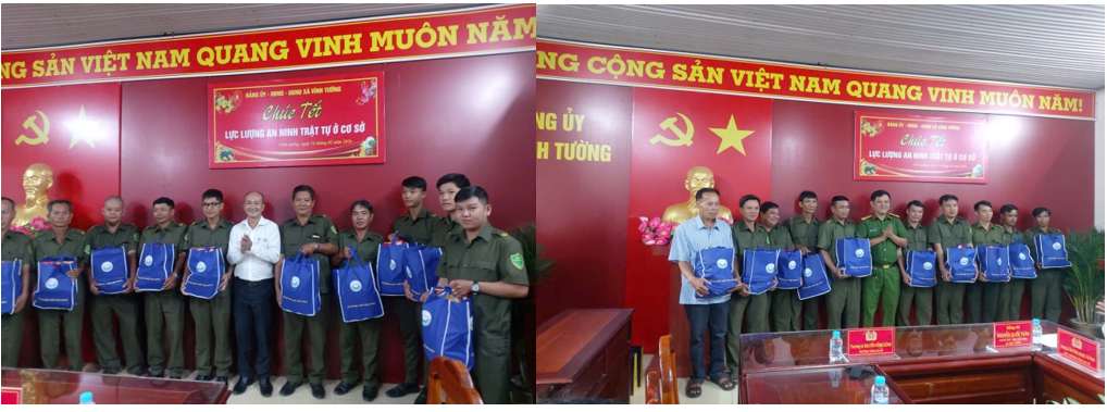 Trong không khí vui tươi, phấn khởi của mùa xuân, được sự thống nhất của Đảng ủy, Hội đồng nhân dân, Ủy ban nhân dân xã, Công an xã Vĩnh Tường đã tổ chức tặng quà cho 62 đồng chí là lực lượng An ninh, trật tự ở cơ sở của 20 ấp trên địa bàn nhân dịp Xuân Bính Ngọ 2026. Đến dự và phát biểu tại buổi lễ, Nguyễn Quốc Toàn, Phó Bí thư Đảng ủy, Chủ tịch Ủy ban nhân dân xã ghi nhận, cảm ơn những đóng góp quý báo của lực lượng An ninh, trật tự ở cơ sở trong công tác đảm bảo trật tự an toàn xã hội trên địa bàn thời gian qua, khẳng định đây là cánh tay nối dài của lực lượng Công an xã. Mặc dù còn nhiều khó khăn về phụ cấp, kinh phí hoạt động nhưng các đồng chí luôn kề vai sát cánh cùng Công an xã hoàn thành nhiệm vụ chính trị được giao, đặc biệt là trong công tác nắm tình hình, giải quyết mâu thuẫn nội bộ trong quần chúng Nhân dân, phòng ngừa, phát hiện, ngăn chặn tội phạm và vi phạm pháp luật, xây dựng phong trào toàn dân bảo vệ an ninh Tổ quốc, tuần tra, công tác quản lý hành chính về trật tự xã hội, gần đây nhất là công tác tổng kiểm tra, rà soát cư trú.