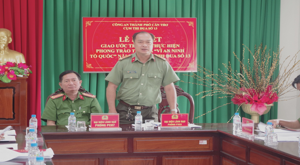 Phát biểu tại buổi lễ, đồng chí Thượng tá Nguyễn Ngọc Lành, đại diện Phòng PX03 đánh giá cao sự chủ động, tinh thần đoàn kết của Công an các đơn vị trong Cụm thi đua; đồng chí Thượng tá đề nghị Công an các đơn vị trong Cụm thi đua tiếp tục phát huy tinh thần trách nhiệm, tích cực, sáng tạo trong các mặt công tác nói chung và thực hiện các tiêu chí thi đua nói riêng; nâng cao hiệu quả công tác phối hợp nhằm bảo đảm tình hình an ninh, trật tự trên địa bàn, góp phần phục vụ nhiệm vụ phát triển kinh tế - xã hội của địa phương; đồng thời gửi lời chúc Cụm thi đua 13 sẽ đạt được nhiều thành tích nổi bật trong phong trào thi đua “Vì An ninh Tổ quốc” năm 2026.