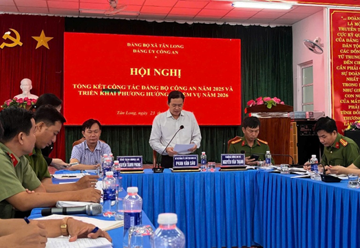 Phát biểu chỉ đạo tại Hội nghị, lãnh đạo Đảng ủy, Ủy ban nhân dân xã ghi nhận và biểu dương những nỗ lực, thành tích mà Đảng ủy Công an xã Tân Long đã đạt được trong năm 2025; đồng thời đề nghị Đảng ủy Công an xã tiếp tục phát huy vai trò nòng cốt trong công tác bảo đảm an ninh, trật tự, xây dựng lực lượng Công an xã trong sạch, vững mạnh, đáp ứng yêu cầu nhiệm vụ trong tình hình mới.