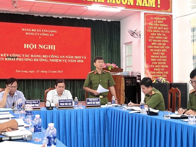 Chỉ đạo Hội nghị có đồng chí Phan Văn Sáu, Bí thư Đảng ủy, Chủ tịch Hội đồng nhân dân xã; đồng chí Nguyễn Thanh Phong, Phó Bí thư Đảng ủy, Chủ tịch Ủy ban nhân dân xã. Về phía Đảng ủy Công an xã, có đồng chí Thượng tá Nguyễn Văn Thạnh, Bí thư Đảng ủy Công an, Trưởng Công an xã chủ trì Hội nghị; các đồng chí Ủy viên Ban Chấp hành Đảng bộ Công an xã; Bí thư, Phó Bí thư các chi bộ trực thuộc cùng toàn thể đảng viên tham dự. Năm 2025, dưới sự lãnh đạo trực tiếp của Đảng ủy Công an thành phố Cần Thơ, Đảng ủy xã, Đảng bộ Công an xã Tân Long đã phát huy tinh thần đoàn kết, chủ động tham mưu và tổ chức thực hiện hiệu quả các nhiệm vụ được giao, góp phần giữ vững ổn định an ninh chính trị, trật tự an toàn xã hội trên địa bàn. Công tác xây dựng Đảng tiếp tục được quan tâm, chú trọng; việc học tập, quán triệt và triển khai thực hiện các nghị quyết, chỉ thị của Đảng được tổ chức nghiêm túc, hiệu quả. Công tác giáo dục chính trị tư tưởng cho cán bộ, đảng viên được tăng cường; kỷ luật, kỷ cương được giữ vững; tinh thần trách nhiệm, ý thức phục vụ Nhân dân của cán bộ, chiến sĩ ngày càng được nâng cao. Lực lượng Công an xã chủ động nắm chắc tình hình địa bàn, kịp thời tham mưu giải quyết các vụ việc ngay từ cơ sở, không để phát sinh phức tạp, điểm nóng về an ninh, trật tự.