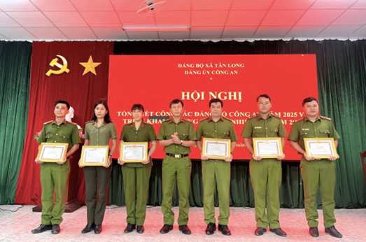 Nhân dịp này, Đảng ủy xã Tân Long đã trao giấy khen cho 01 tập thể và 05 cá nhân có thành tích xuất sắc trong thực hiện nhiệm vụ năm 2025, qua đó kịp thời động viên, khích lệ tinh thần thi đua, cống hiến của cán bộ, đảng viên. Hội nghị tổng kết công tác Đảng bộ Công an xã Tân Long năm 2025 diễn ra thành công tốt đẹp, tạo khí thế thi đua sôi nổi, là tiền đề quan trọng để Đảng ủy Công an xã tiếp tục phấn đấu hoàn thành tốt nhiệm vụ được giao trong năm 2026 và những năm tiếp theo./.