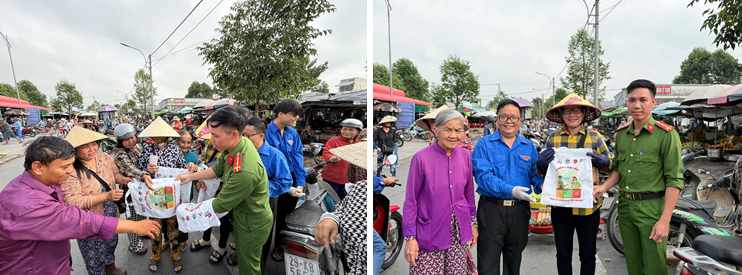 Ảnh: Đoàn viên, thanh niên trao túi vải đi chợ cho bà con tiểu thương và người dân
