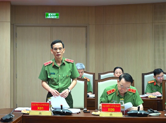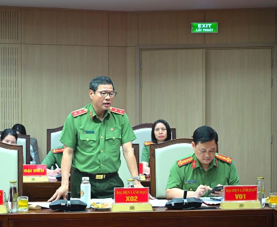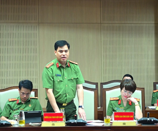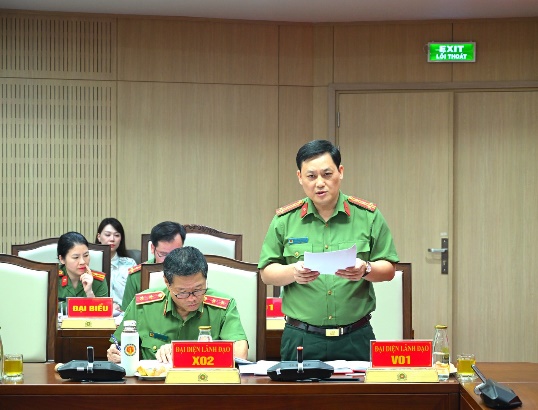 Đại tá Mai Xuân Thảo, Phó Chánh Văn phòng Bộ Công an trình bày báo cáo trung tâm tại Hội nghị.