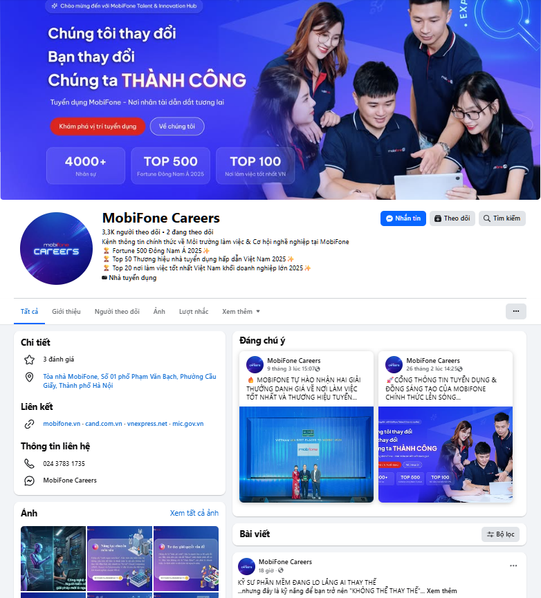 * Fanpage tuyển dụng “MobiFone Careers” đây là kênh thông tin chính thức về tuyển dụng và phát triển nhân lực của Tổng công ty viễn thông MobiFone, nơi cập nhật kịp thời các cơ hội việc làm, chương trình tuyển dụng, hoạt động nghề nghiệp và môi trường làm việc tại MobiFone, đồng thời chia sẻ câu chuyện chuyên môn, dự án tiêu biểu và trải nghiệm thực tế của đội ngũ cán bộ, người lao động, giúp ứng viên và cộng đồng hiểu rõ hơn về tinh thần “MobiFone mới” - chuyên nghiệp, đổi mới và lấy năng lực làm trung tâm.