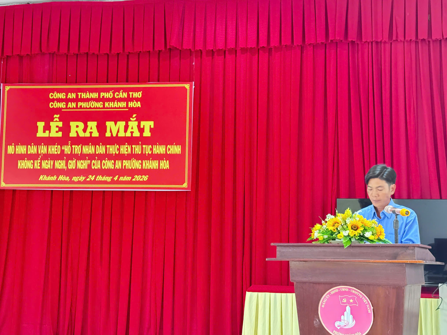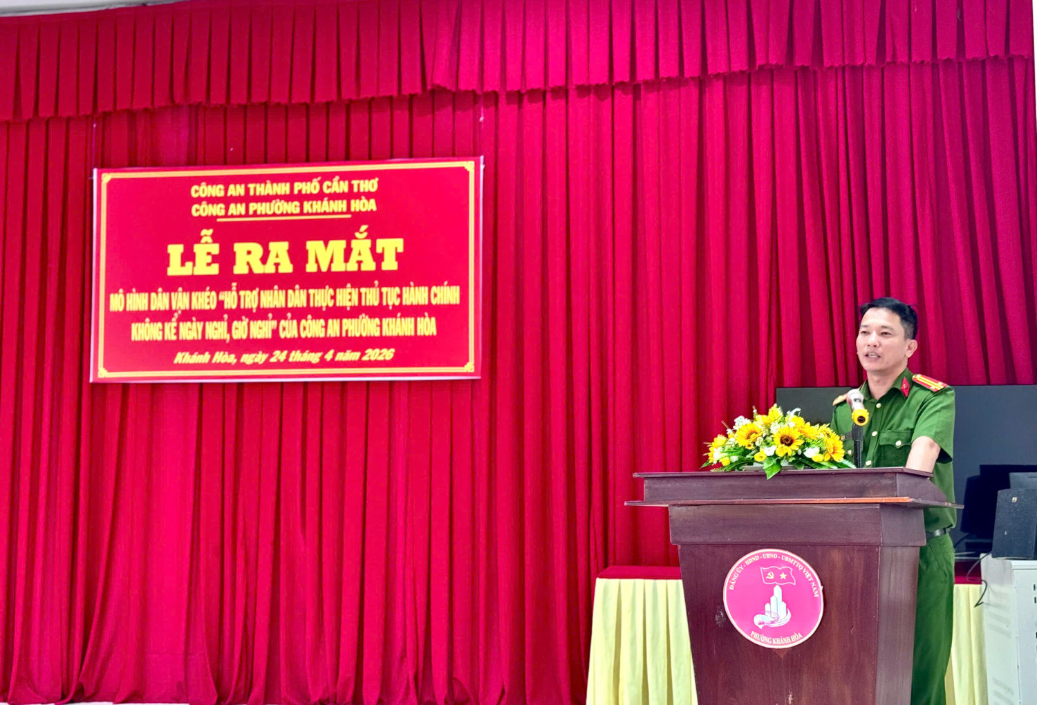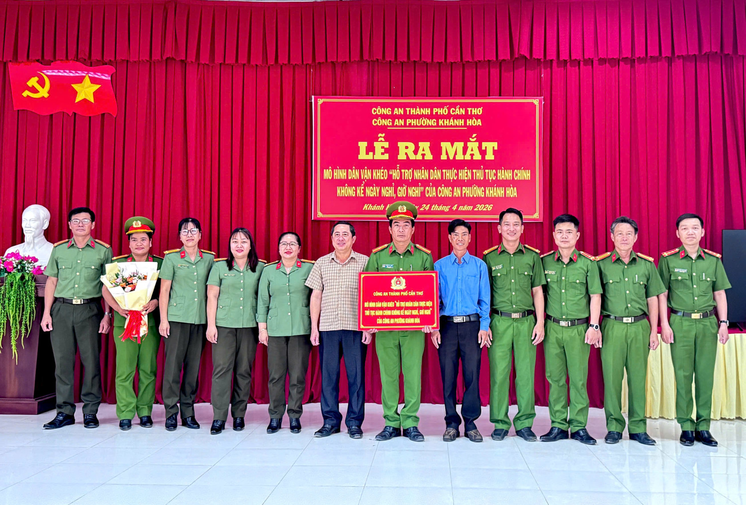 Với tinh thần quyết liệt trong công tác cải cách hành chính, hiện thực hóa phương châm “chính quyền phục vụ Nhân dân” và hưởng ứng tích cực phong trào thi đua Ba nhất “Kỷ luật nhất, Trung thành nhất, Gần dân nhất” của Công an thành phố. Ngày 24/4/2026, Công an phường Khánh Hòa tổ chức lễ ra mắt mô hình Dân vận khéo “Hỗ trợ Nhân dân thực hiện thủ tục hành chính không kể ngày nghỉ, giờ nghỉ”. Dự và chỉ đạo Lễ ra mắt mô hình có đồng chí Ngô Hùng, Bí thư Đảng ủy, Chủ tịch Hội đồng nhân dân phường; đồng chí Lâm Văn Tám, Ủy viên Ban Thường vụ Đảng ủy, Phó Chủ tịch Ủy ban nhân dân phường; đại diện Chỉ huy Đội Theo dõi, hướng dẫn công tác xây dựng phong trào bảo vệ an ninh Tổ quốc, Phòng Tham mưu Công an thành phố cùng các đồng chí Chỉ huy, cán bộ chiến sĩ Công an phường và lực lượng tham gia bảo vệ an ninh, trật tự ở cơ sở.