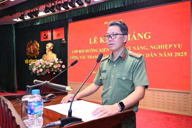 Thừa ủy quyền của lãnh đạo Bộ Công an, Đại tá Mai Xuân Thảo, Phó Chánh Văn phòng Bộ dự và phát biểu tại buổi lễ. Cùng dự có đại diện lãnh đạo một số đơn vị trực thuộc Bộ cùng toàn thể học viên của lớp bồi dưỡng.