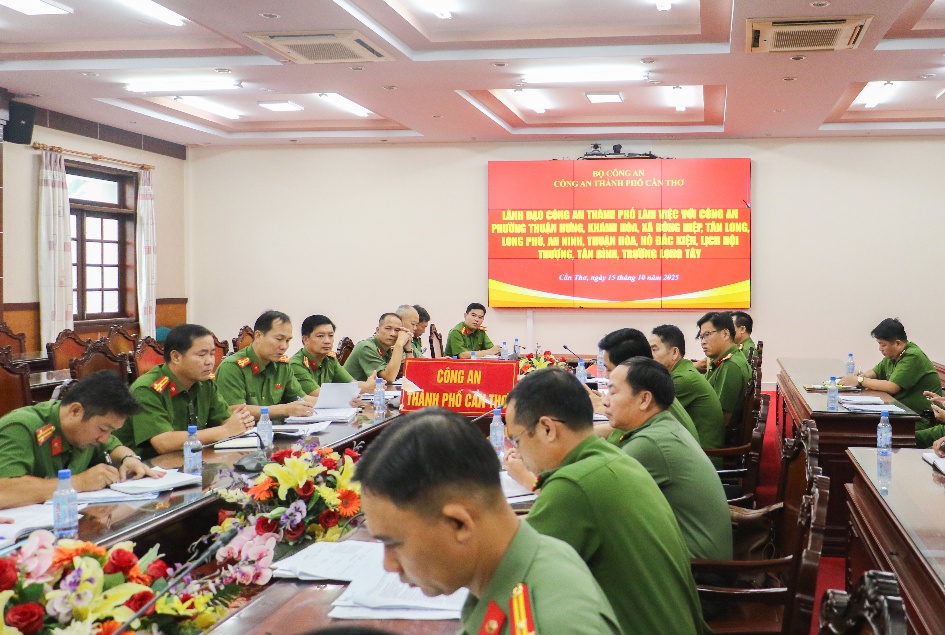 Chiều 15-10, Đại tá Trần Hoàng Độ, Phó Giám đốc Công an thành phố Cần Thơ chủ trì buổi làm việc với Công an 11 xã, phường Thuận Hưng, Khánh Hòa, Đông Hiệp, Tân Long, Long Phú, An Ninh, Thuận Hòa, Hồ Đắc Kiện, Lịch Hội Thượng, Tân Bình, Trường Long Tây. Cùng dự có lãnh đạo các phòng nghiệp vụ Công an thành phố.
