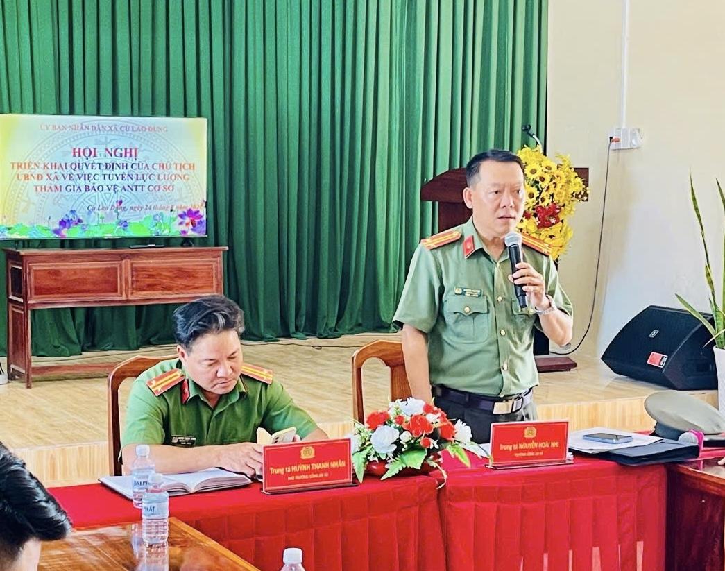 Theo đó, ngày 24/4/2026 được sự ủy quyền của Chủ tịch Ủy ban nhân dân xã Cù Lao Dung, Trung tá Nguyễn Hoài Nhi, Ủy viên Ban Thường vụ Đảng ủy xã, Trưởng Công an xã đã chủ trì hội nghị triển khai Quyết định của Chủ tịch Ủy ban nhân dân xã về việc công nhận tổ viên Tổ tham gia bảo vệ an ninh, trật tự ở cơ sở. Cùng dự hội nghị có các đồng chí chỉ huy Công an xã, Trưởng ban nhân dân các ấp, cán bộ Cảnh sát khu vực và tất cả các đồng chí lực lượng tham gia bảo vệ an ninh, trật tự ở cơ sở trên địa bàn xã Cù Lao Dung.