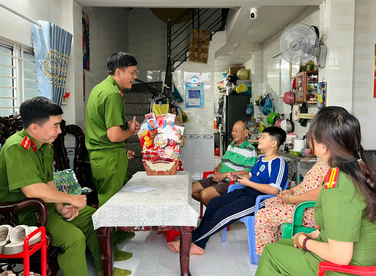 Đồng chí Trung tá Huỳnh Văn Khanh, Phó Trưởng Công an phường Ninh Kiều cùng đoàn công tác trao quà Tết cho gia đình cháu Huỳnh Quang Thành.