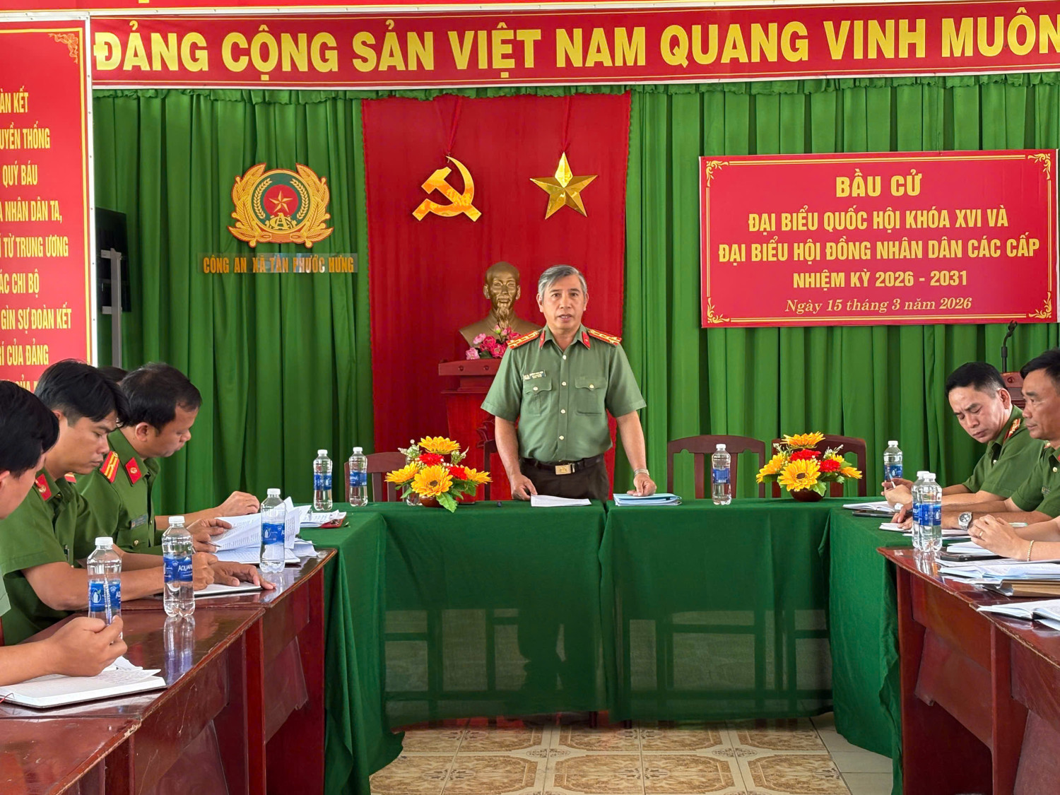 Thay mặt đơn vị, đồng chí Trung tá Nguyễn Văn Chơn, Trưởng Công an xã Tân Phước Hưng đã báo cáo với Đoàn công tác về công tác chuẩn bị phục vụ bầu cử; chủ động xây dựng kế hoạch bảo đảm an ninh, trật tự; phân công lực lượng trực, tuần tra kiểm soát tại các khu vực trọng điểm; phối hợp với các ban, ngành, đoàn thể địa phương nắm chắc tình hình địa bàn, kịp thời phát hiện và xử lý các vấn đề phát sinh. Công an xã cũng đẩy mạnh công tác tuyên truyền, vận động Nhân dân chấp hành nghiêm các quy định của pháp luật, tham gia bầu cử đầy đủ, đúng quy định; đồng thời tăng cường quản lý cư trú, rà soát các đối tượng có nguy cơ ảnh hưởng đến an ninh, trật tự để có biện pháp phòng ngừa phù hợp. Bên cạnh đó, cần triển khai đồng bộ các Phương án bảo đảm an ninh, an toàn tại các điểm bầu cử, tạo điều kiện thuận lợi để Nhân dân tham gia bỏ phiếu trong không khí an toàn, dân chủ và đúng quy định. Đặc biệt chú trọng công tác bảo vệ thùng phiếu tại các điểm bầu cử và thùng phiếu lưu động phục vụ cử tri không thể trực tiếp đến điểm bầu cử, bảo đảm mọi công dân đều có thể thực hiện quyền bầu cử của mình. Đồng thời thực hiện tốt công tác bảo vệ quá trình kiểm phiếu, vận chuyển thùng phiếu về Ủy ban bầu cử sau khi kết thúc bỏ phiếu, bảo đảm an toàn, đúng quy định và tham mưu thục hiện tốt công tác bảo vệ bí mật nhà nước. Song song đó, đồng chí Phó Giám đốc Công an thành phố cũng chỉ đạo Công an xã Tân Phước Hưng phối hợp với các ban, ngành, đoàn thể địa phương tăng cường công tác tuyên truyền về cuộc bầu cử trên địa bàn; thường xuyên kiểm tra hệ thống băng rôn, pano, áp phích, cờ phướn, cờ Tổ quốc và các bảng niêm yết danh sách đại biểu ứng cử tại các tuyến đường, khu vực công cộng và các điểm bầu cử; kịp thời khắc phục, thay thế khi có hư hỏng nhằm bảo đảm công tác tuyên truyền được thực hiện hiệu quả, góp phần tạo không khí phấn khởi, trang trọng hướng tới ngày hội lớn của toàn dân. Tiếp thu ý kiến chỉ đạo của Đoàn công tác, đồng chí Trung tá Nguyễn Văn Chơn, Trưởng Công an xã Tân Phước Hưng khẳng định đơn vị sẽ nghiêm túc triển khai thực hiện các nội dung chỉ đạo của đồng chí Phó Giám đốc Công an thành phố. Thời gian tới, Công an xã sẽ tiếp tục nâng cao tinh thần cảnh giác, rà soát và cập nhật đầy đủ danh sách cử tri, tăng cường đấu tranh trấn áp các loại tội phạm và tệ nạn xã hội, đồng thời đẩy mạnh công tác tuyên truyền để Nhân dân hiểu rõ ý nghĩa, tầm quan trọng của cuộc bầu cử. Với sự quan tâm chỉ đạo quyết liệt của đồng chí Phó Giám đốc Công an thành phố cùng sự quyết tâm của tập thể cán bộ, chiến sĩ, Công an xã Tân Phước Hưng sẽ thực hiện tốt công tác bảo đảm an ninh, trật tự trước, trong và sau cuộc bầu cử, góp phần để cuộc bầu cử trên địa bàn diễn ra an ninh, an toàn.