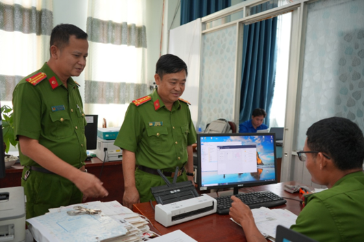Đại tá Lê Đức Bảy, Phó Giám đốc Công an thành phố Cần Thơ thăm hỏi, kiểm tra cán bộ Công an xã Vĩnh Trinh làm nhiệm vụ cấp đăng ký xe cho người dân