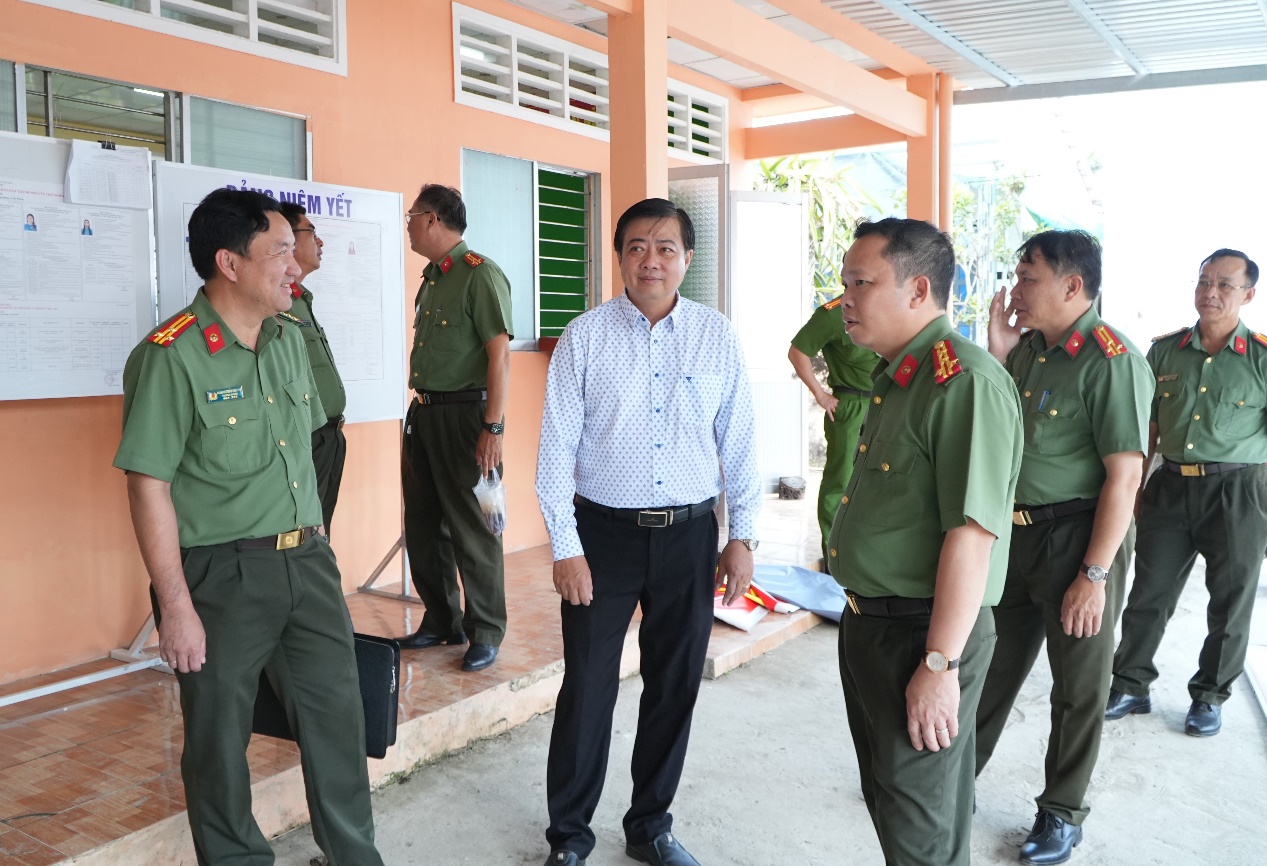 Đại tá Nguyễn Văn Thắng, Phó Giám đốc Công an thành phố cùng đoàn kiểm tra các khu vực bỏ phiếu trên địa bàn thành phố Cần Thơ