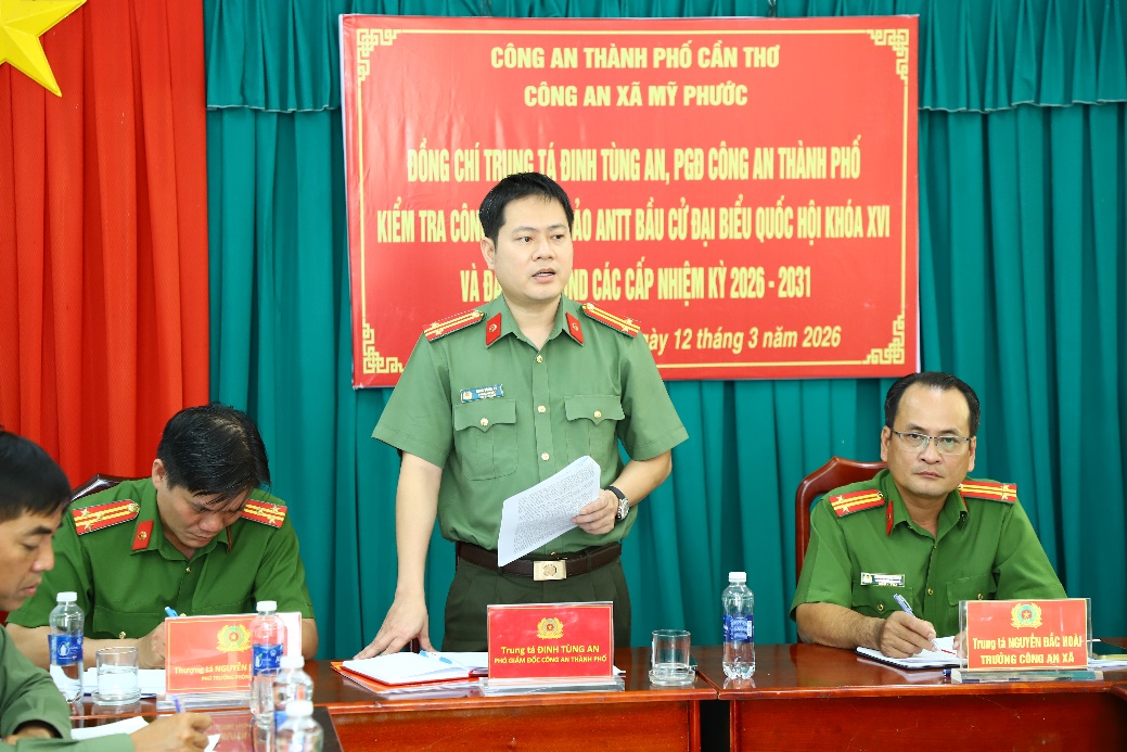 Ngày 12/03, Đoàn công tác của Công an thành phố Cần Thơ do Trung tá Đinh Tùng An, Phó Giám đốc Công an thành phố làm Trưởng đoàn đã đến kiểm tra công tác bảo đảm an ninh, trật tự phục vụ bầu cử đại biểu Quốc hội khóa XVI và đại biểu Hội đồng nhân dân các cấp nhiệm kỳ 2026 – 2031 tại Công an xã Phú Lộc và Mỹ Phước.