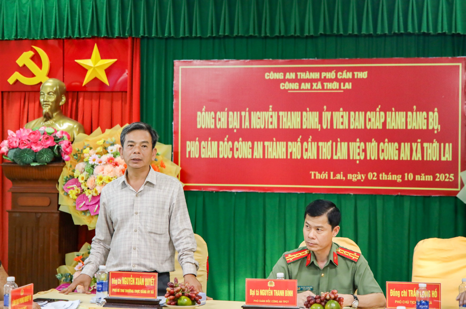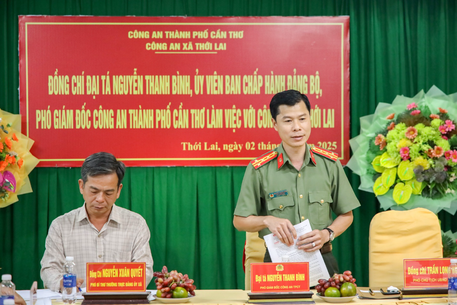 Phát biểu tại buổi làm việc, Đại tá Nguyễn Thanh Bình, Ủy viên Ban Chấp hành Đảng bộ, Phó Giám đốc Công an thành phố, đã ghi nhận, đánh giá cao sự nỗ lực, tinh thần trách nhiệm và những kết quả đạt được của Công an xã Thới Lai, đặc biệt là trong công tác nắm tình hình, tham mưu cho cấp ủy, chính quyền địa phương, triển khai hiệu quả các kế hoạch bảo đảm an ninh, trật tự, góp phần giữ vững ổn định tình hình địa bàn xã. Đồng chí Phó Giám đốc nhấn mạnh: Công an xã tiếp tục phát huy những kết quả đạt được, tập trung làm tốt công tác quản lý nhà nước về an ninh, trật tự; chủ động phòng ngừa, đấu tranh với các loại tội phạm, tệ nạn xã hội, đặc biệt là ma túy – lĩnh vực vẫn còn tiềm ẩn nhiều nguy cơ phức tạp, đòi hỏi Công an xã phải tăng cường các biện pháp phòng ngừa, kiên quyết đấu tranh, triệt xóa các tụ điểm tệ nạn, không để phát sinh điểm nóng. Đồng chí yêu cầu đơn vị tiếp tục quản lý chặt chẽ các loại đối tượng, nâng cao hiệu quả công tác tuyên truyền, giáo dục pháp luật trong Nhân dân, nhất là thanh, thiếu niên; đồng thời phát huy vai trò nòng cốt trong xây dựng phong trào Toàn dân bảo vệ an ninh Tổ quốc, tạo thế trận an ninh nhân dân vững chắc từ cơ sở; nâng cao tinh thần trách nhiệm, thái độ phục vụ Nhân dân, tăng cường kỷ luật, kỷ cương, xây dựng lực lượng Công an xã thật sự trong sạch, vững mạnh, đáp ứng yêu cầu, nhiệm vụ trong tình hình mới.