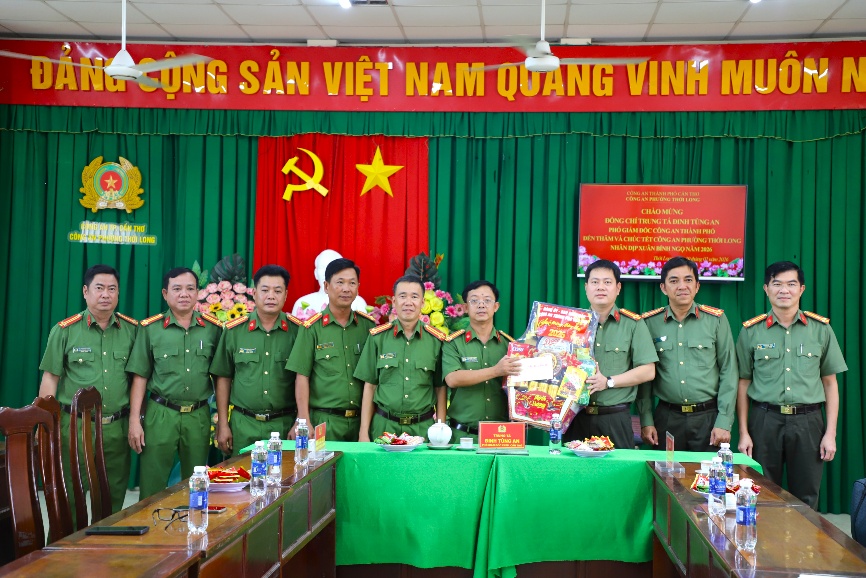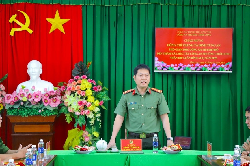 Thực hiện Kế hoạch số 67/KH-CATP-PX01 của Công an Thành phố Cần Thơ do Thiếu tướng Huỳnh Việt Hòa, Ủy viên Ban Thường vụ Thành ủy, Bí thư Đảng ủy, Giám đốc Công an Thành phố ký về việc tổ chức gặp mặt và thăm, tặng quà gia đình chính sách, cán bộ Công an hưu trí, người có công trong CAND, cán bộ chiến sĩ có hoàn cảnh đặc biệt khó khăn và Công an các địa phương thuộc Công an thành phố nhân dịp tết Nguyên đán Bính Ngọ năm 2026, ngày 10/02/2026, Trung tá Đinh Tùng An, Phó Giám đốc Công an thành phố đến thăm, chúc tết các đồng chí Nguyên lãnh đạo thành phố đã nghỉ hưu qua các thời kỳ và Công an phường Thới Long, trên địa bàn tỉnh An Giang và Thành phố Cần Thơ.