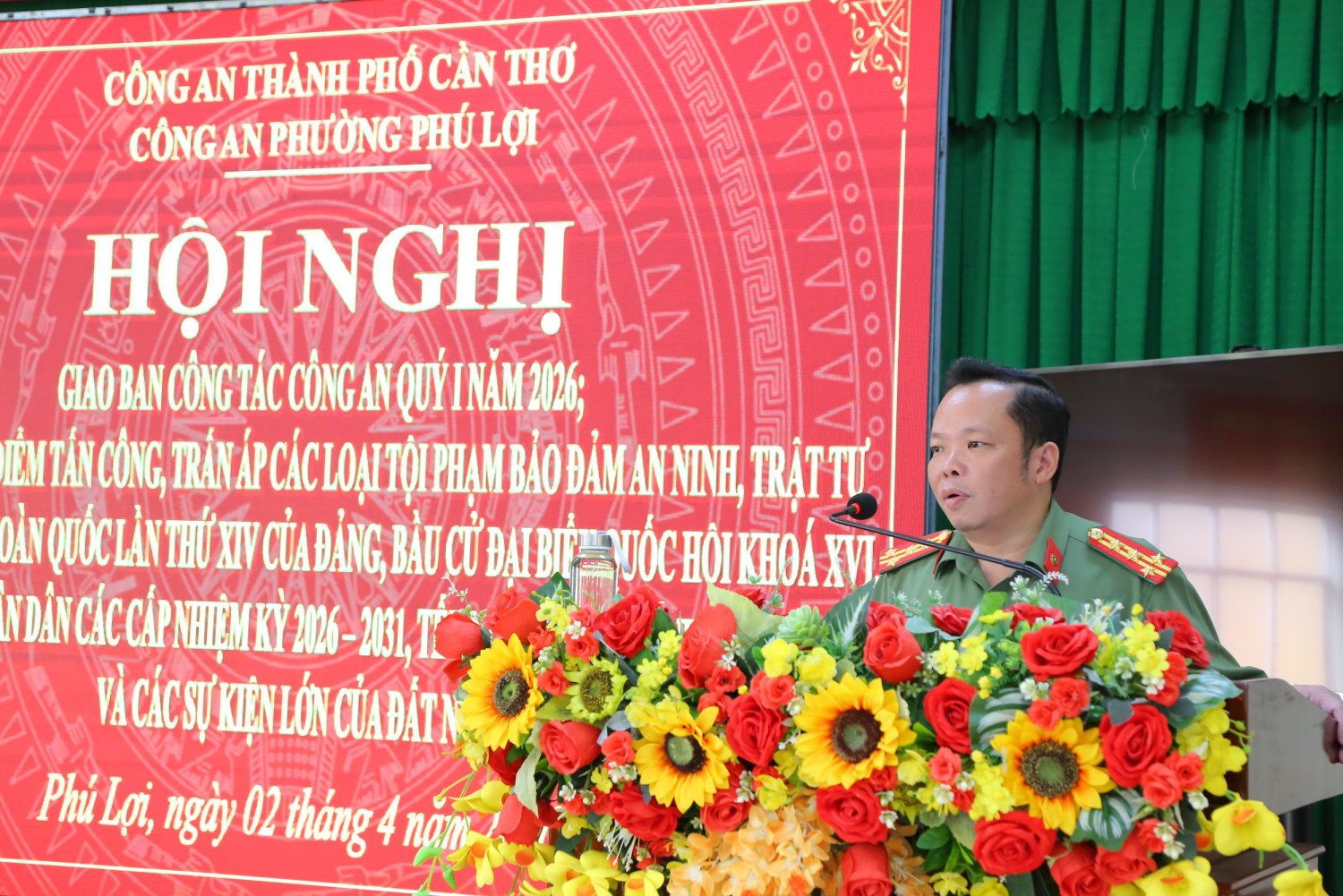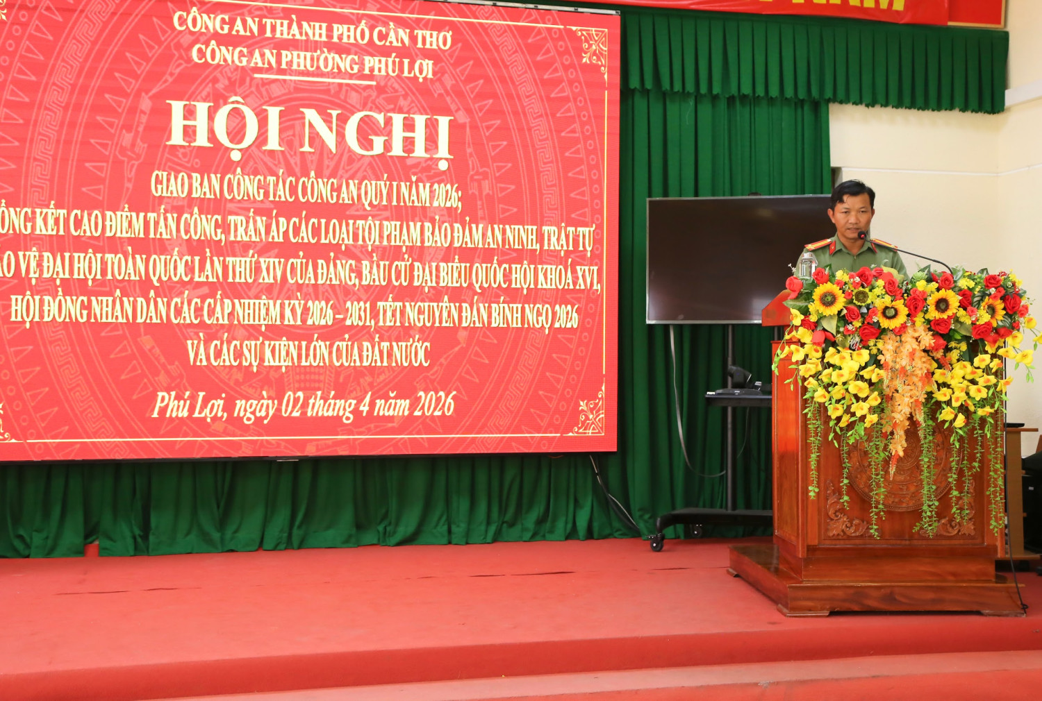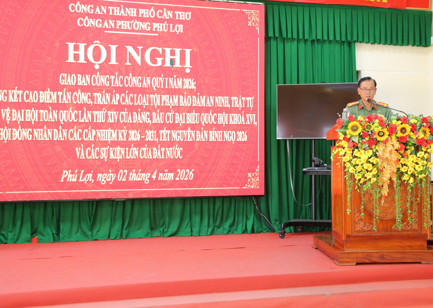 Chiều ngày 02/4, Công an phường Phú Lợi, thành phố Cần Thơ tổ chức Hội nghị giao ban công tác Công an quý I năm 2026; tổng kết cao điểm tấn công trấn áp các loại tội phạm bảo đảm an ninh, trật tự (ANTT) bảo vệ Đại hội Đảng toàn quốc lần thứ XIV của Đảng, bầu cử đại biểu Quốc hội khóa XVI, Hội đồng nhân dân các cấp nhiệm kỳ 2026 - 2031, Tết Nguyên đán Bính Ngọ 2026 và các sự kiện lớn của đất nước (viết tắt là cao điểm tấn công). Dự và phát biểu chỉ đạo hội nghị có Đại tá Nguyễn Văn Thắng, Ủy viên Ban Thường vụ Đảng ủy, Phó Giám đốc Công an thành phố và đồng chí Lê Quốc Tuấn, Phó Chủ tịch Ủy ban nhân dân phường Phú Lợi. Tham dự hội nghị có chỉ huy, cán bộ, chiến sĩ Công an phường và lực lượng ANTT ở cơ sở trên địa bàn.
