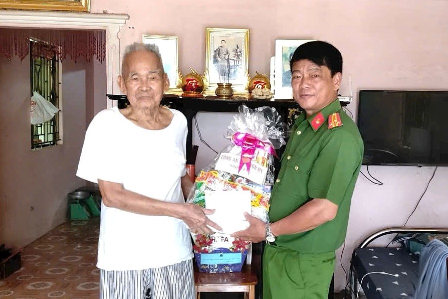 Thượng tá Lâm Văn Nhuần, Trưởng Công an xã Nhơn Mỹ đến thăm, chúc Tết Anh hùng LLVTND Võ Đức Thành, hiện đang sinh sống trên địa bàn.
