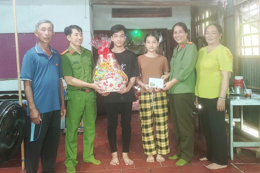 Chăm lo cho các cháu được Công an xã Nhơn Mỹ nhận đỡ đầu. Món quà Tết không chỉ mang giá trị vật chất mà còn chứa đựng tình yêu thương, sự động viên kịp thời của những “người cha, người mẹ đỡ đầu” mang sắc phục Công an.