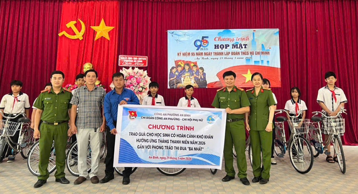 Nổi bật trong chuỗi hoạt động là các chương trình chăm lo, hỗ trợ Nhân dân và thiếu nhi có hoàn cảnh khó khăn. Chi đoàn Công an phường An Bình đã phối hợp các đoàn thể tổ chức thăm hỏi, động viên gia đình em Châu Thanh Cường, đồng thời hỗ trợ số tiền 10.500.000 đồng, góp phần giúp gia đình vượt qua khó khăn, sớm ổn định cuộc sống. Bên cạnh đó, đơn vị còn trao tặng 10 chiếc xe đạp cho học sinh có hoàn cảnh khó khăn, tiếp sức các em đến trường, lan tỏa tinh thần tương thân, tương ái trong cộng đồng.