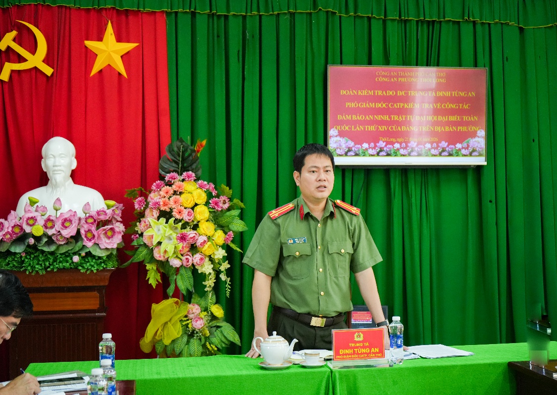 Ngày 21/01/2026, Đoàn kiểm tra số 8 của Công an thành phố Cần Thơ do đồng chí Trung tá Đinh Tùng An, Phó Giám đốc Công an thành phố làm trưởng đoàn đã trực tiếp kiểm tra công tác bảo đảm an ninh, trật tự phục vụ Đại hội đại biểu toàn quốc lần thứ XIV của Đảng tại Công an phường Thới Long.