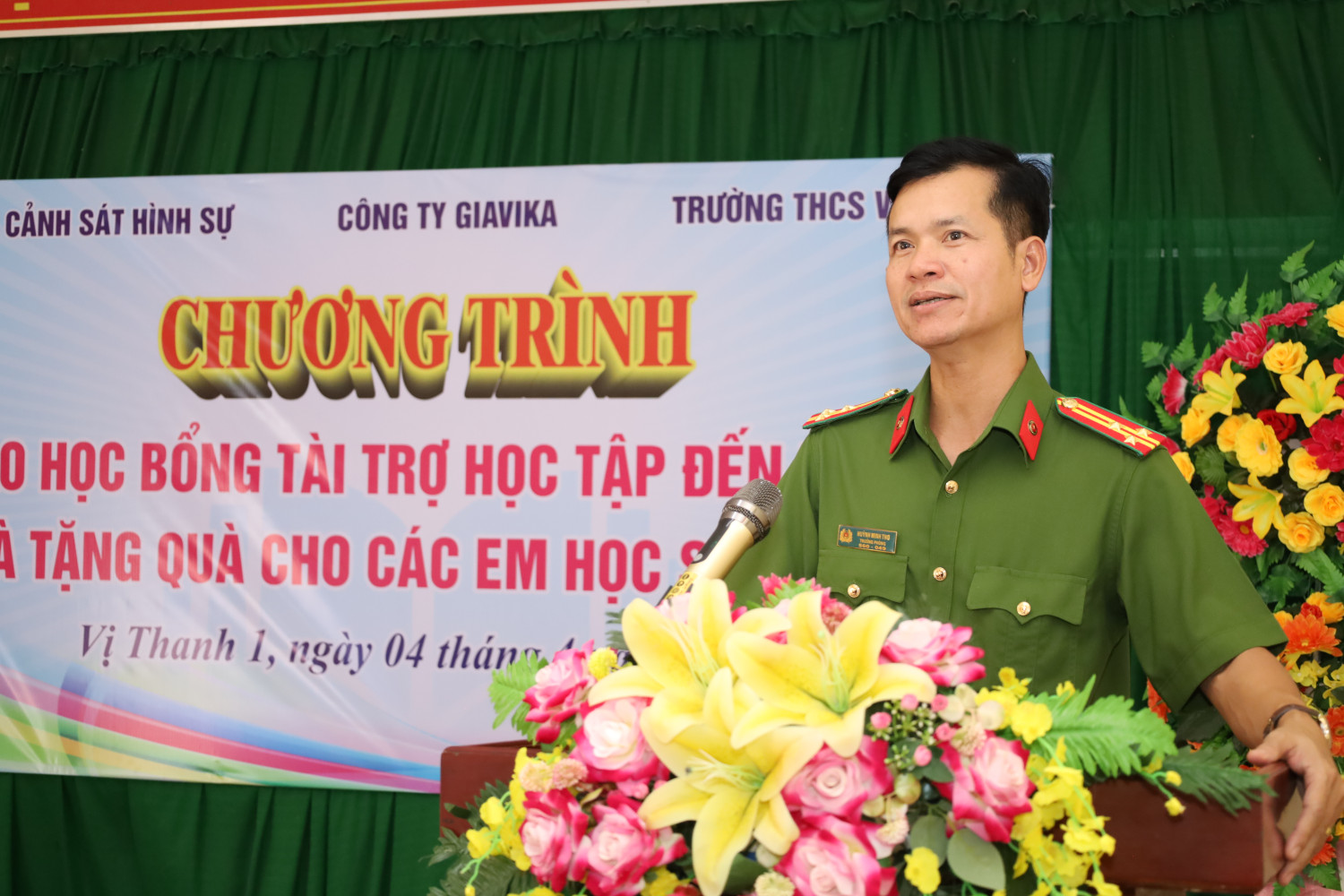 Thượng tá Huỳnh Minh Thơ, Trưởng phòng Cảnh sát hình sự phát biểu tại chương trình tặng học bổng cho học sinh Trường THCS Vị Đông